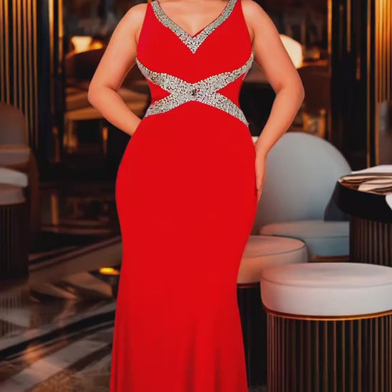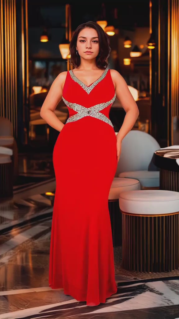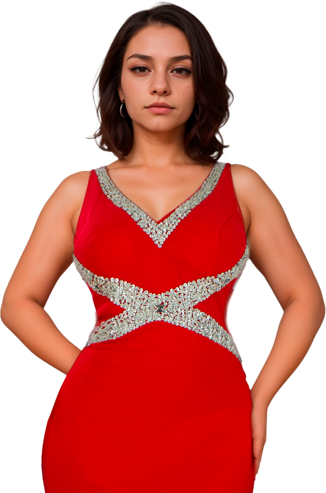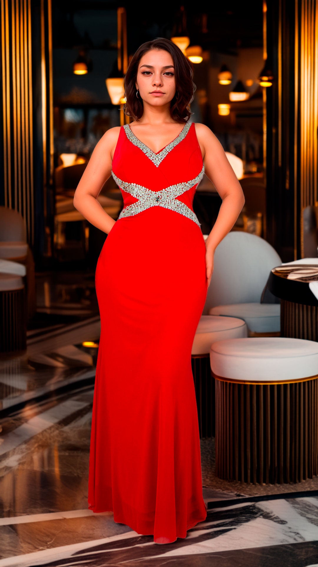 Este vestido rojo de corte sirena destaca por su elegancia y sofisticación. Las aplicaciones bordadas en la cintura realzan la silueta, aportando un detalle que combina estilo y distinción. Ideal para ocasiones especiales, su diseño ajustado resalta la figura con un toque de glamour y refinamiento.