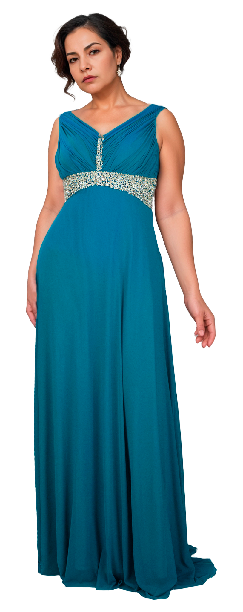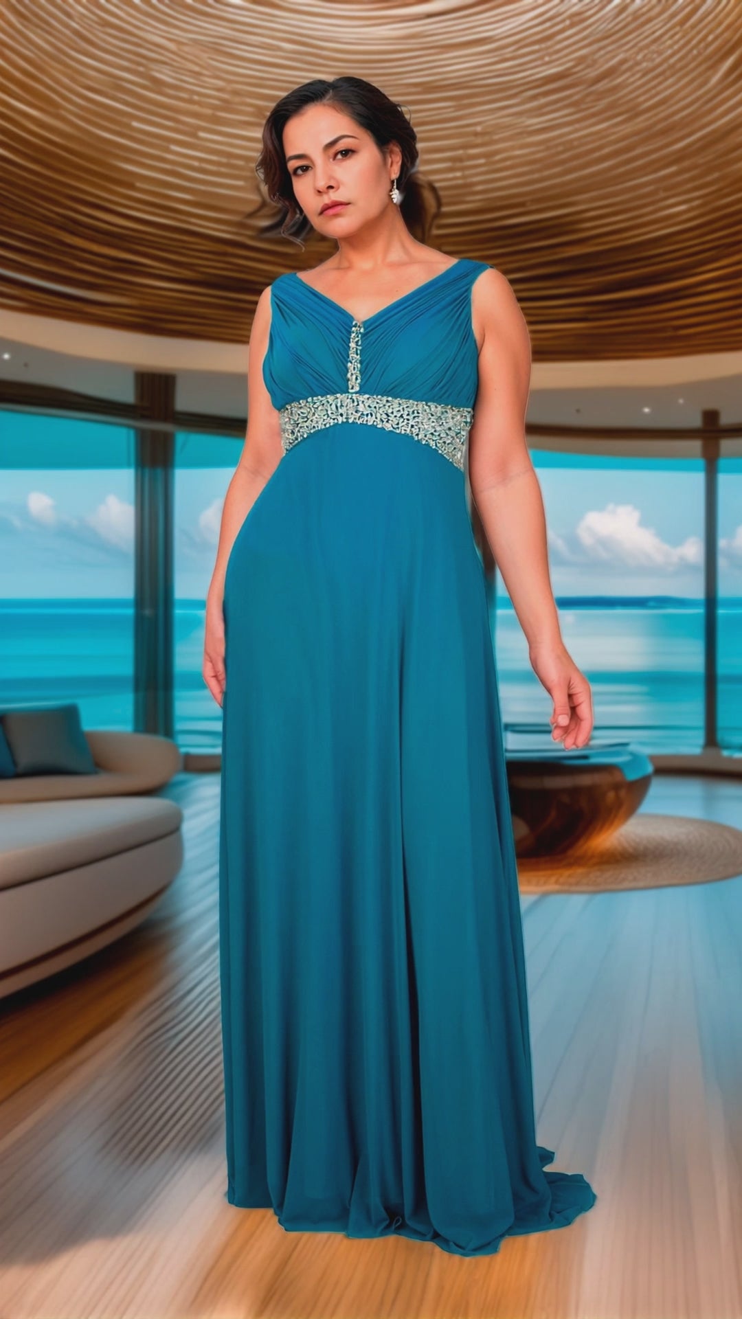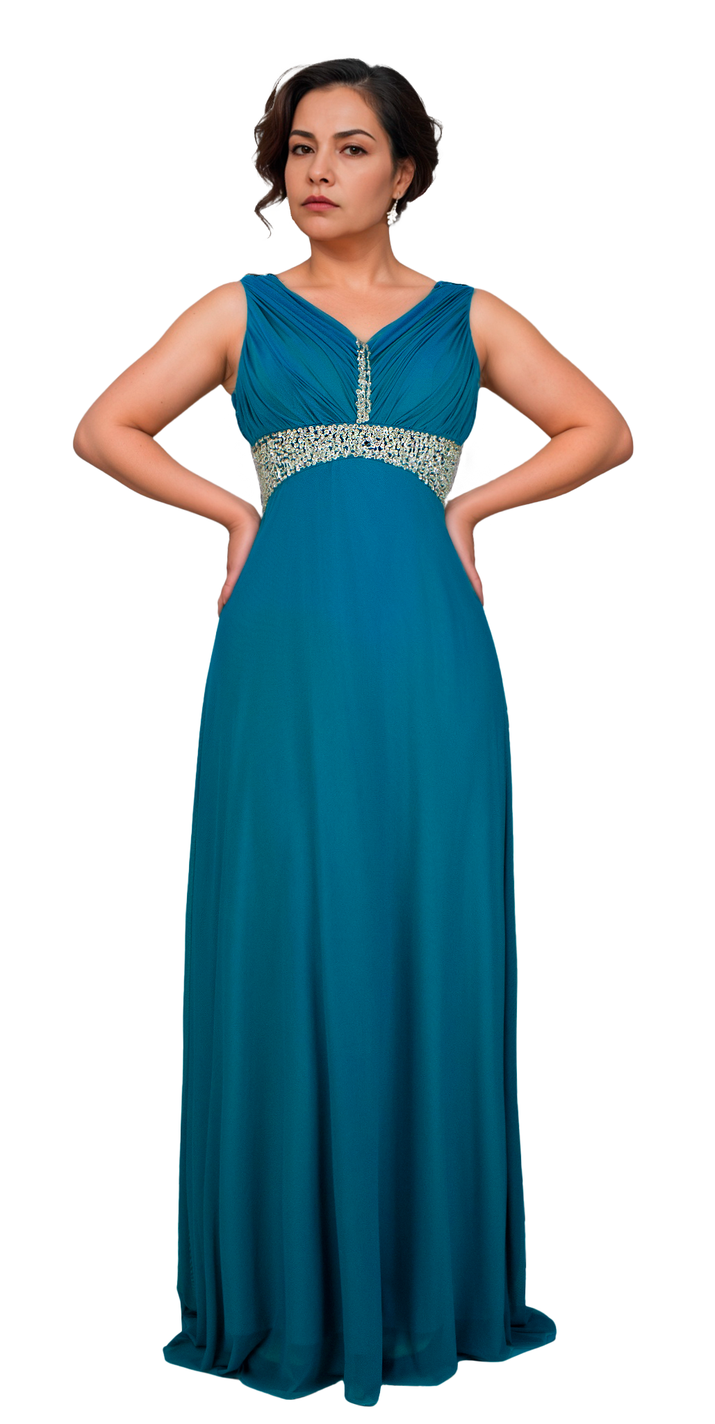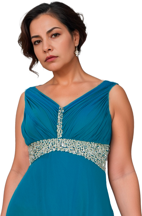Este elegante vestido presenta aplicaciones detalladas en la cintura que realzan la figura con sofisticación. Su escote en V aporta un toque de estilo refinado, mientras que la espalda cubierta ofrece discreción y comodidad. El corte princesa con caída fluida garantiza un ajuste favorecedor y un movimiento elegante, ideal para ocasiones especiales donde se busca un equilibrio entre glamour y distinción.