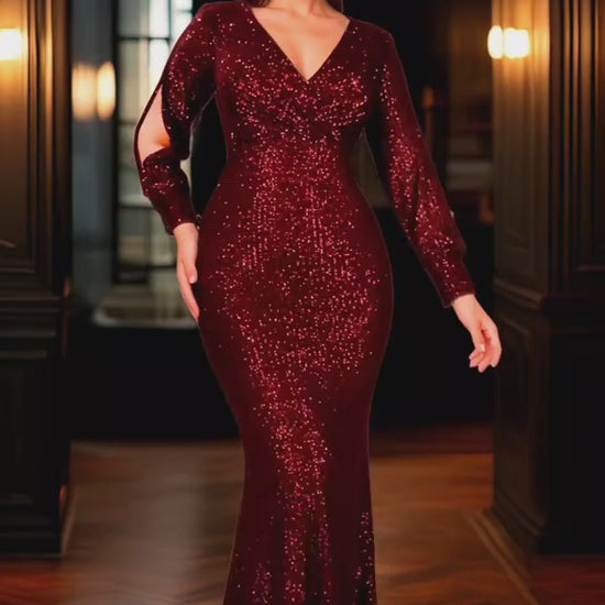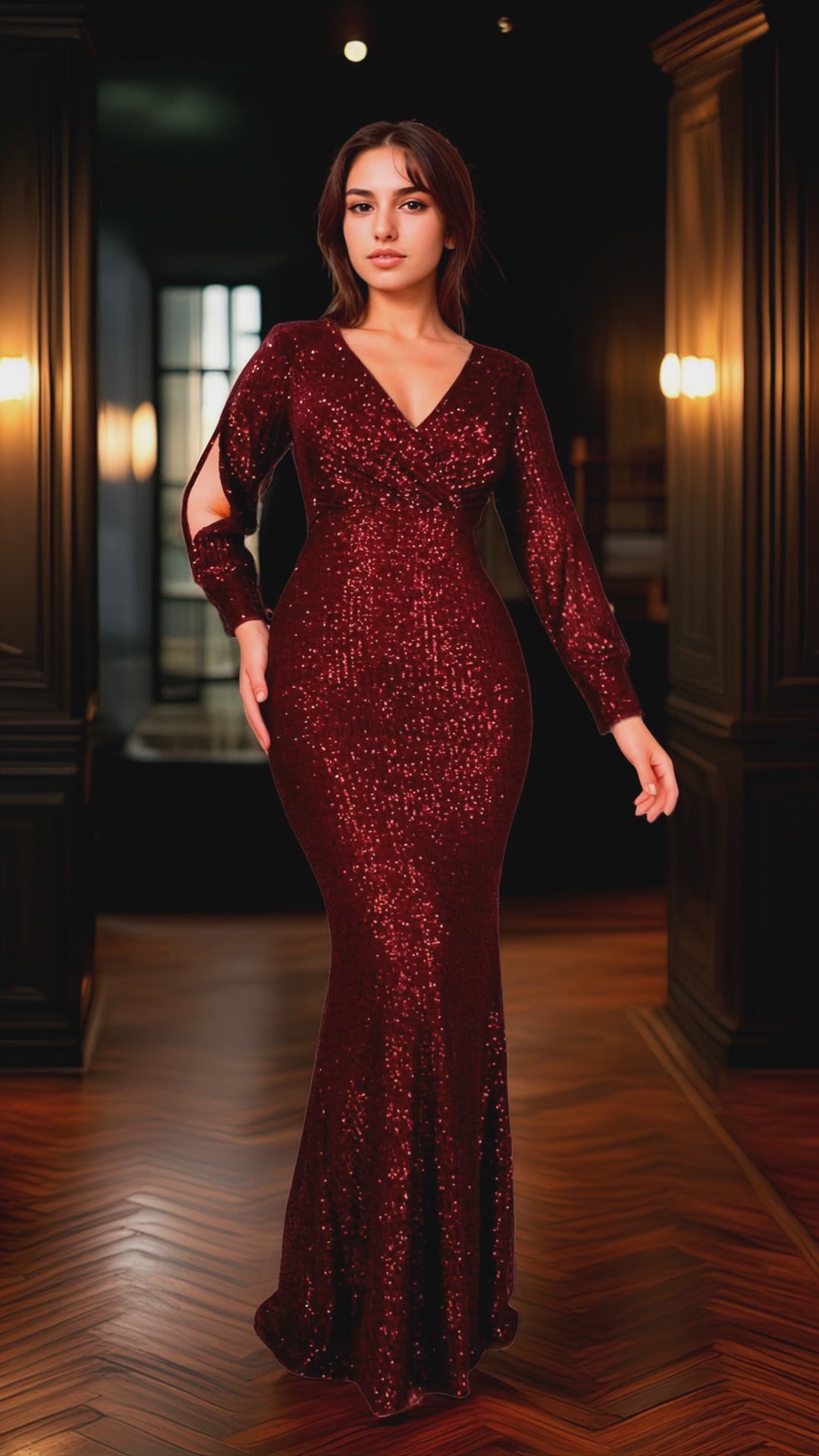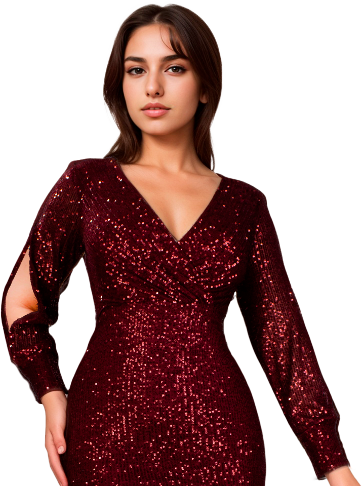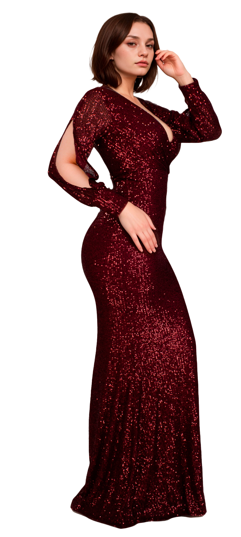 Este vestido largo entallado en color vino está confeccionado con lentejuelas que aportan un brillo sofisticado y elegante. Su diseño de manga larga ofrece un ajuste cómodo y estilizado, ideal para eventos formales donde se busca destacar con un toque de glamour y distinción. Perfecto para quienes desean una silueta definida sin sacrificar la comodidad.