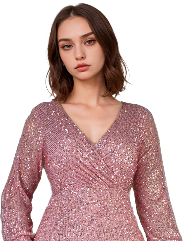 Este vestido de manga larga en tono rosa destaca por su escote profundo y el acabado en lentejuelas que aportan un brillo sofisticado. Su corte entallado tipo sirena realza la silueta, ofreciendo una figura elegante y estilizada, ideal para eventos formales o de noche donde se busca un look impactante y moderno.