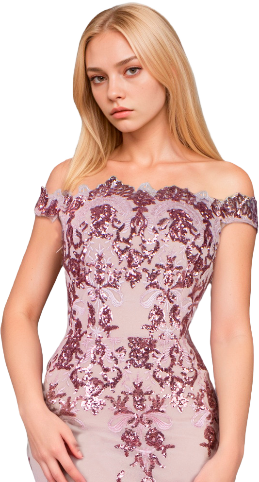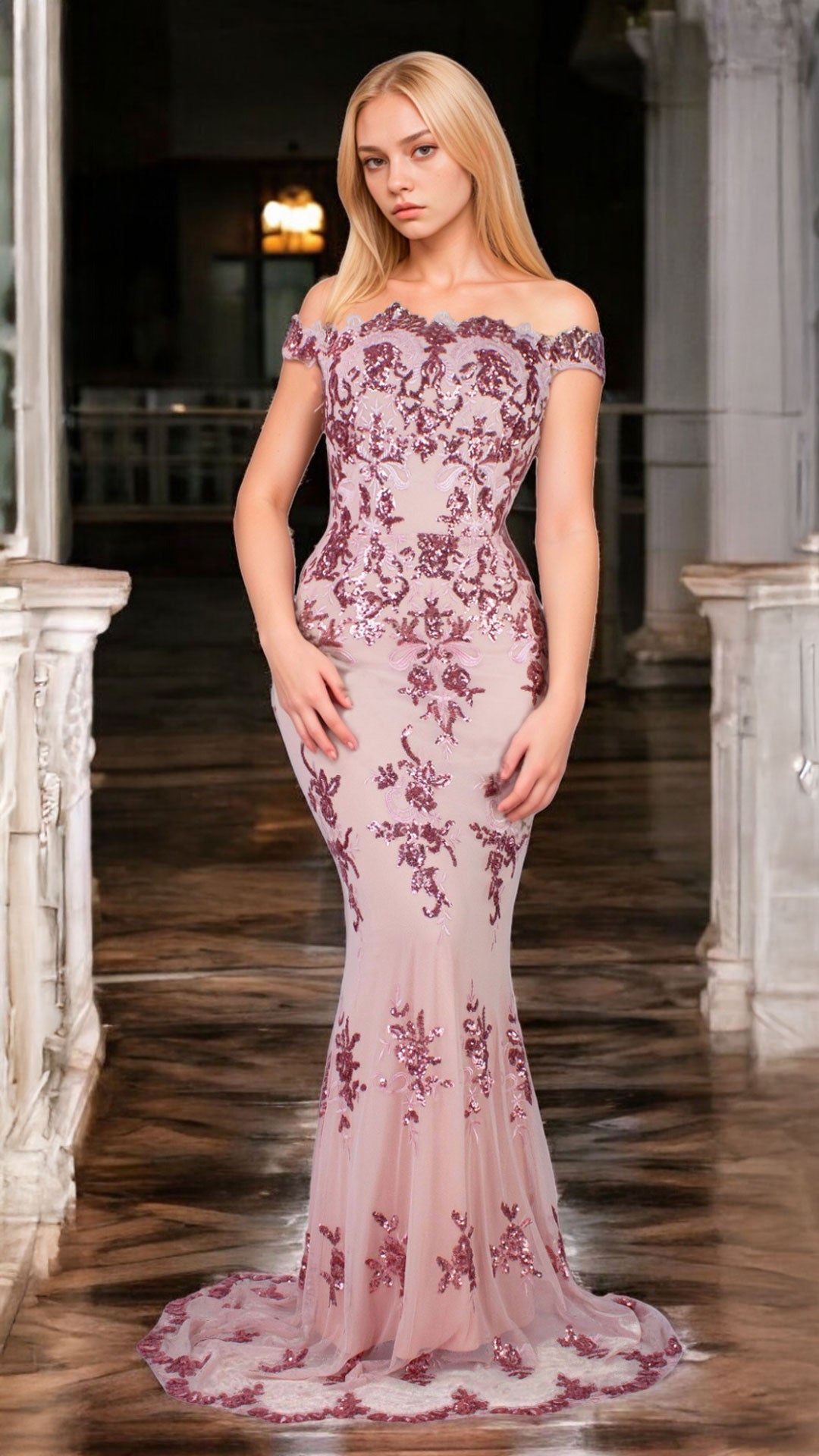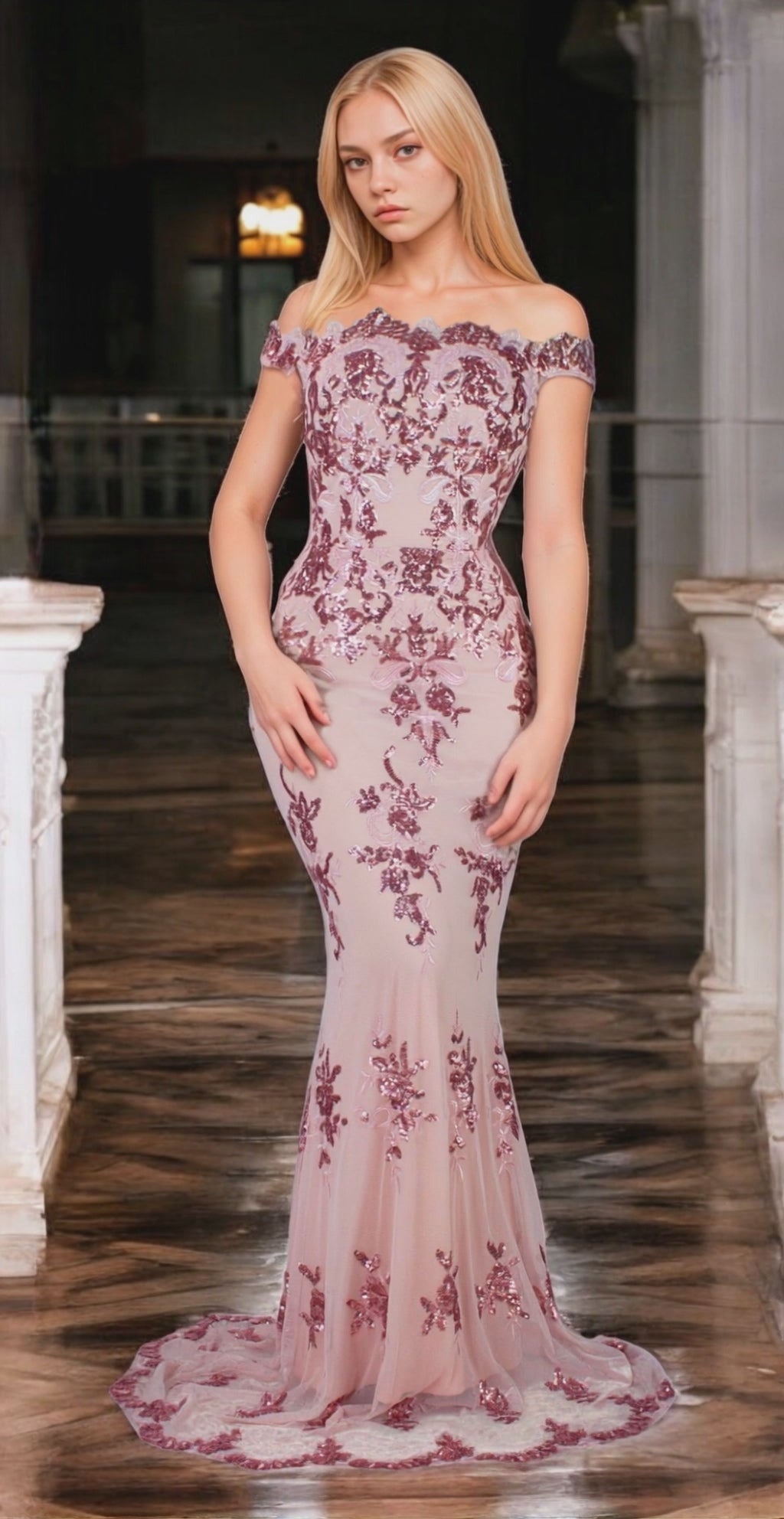 Este vestido de corte sirena en rosa destaca por su elegante diseño de hombros descubiertos y delicado bordado, que realza la silueta femenina con sofisticación. Ideal para ocasiones especiales, combina estilo y comodidad, ofreciendo un ajuste ceñido que resalta la figura con un toque romántico y moderno. Perfecto para quienes buscan un look refinado y distintivo.
