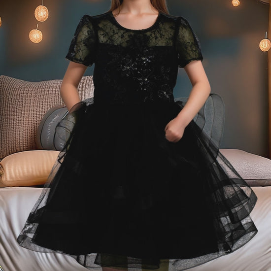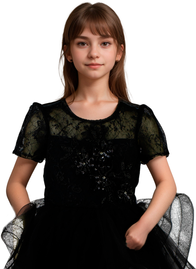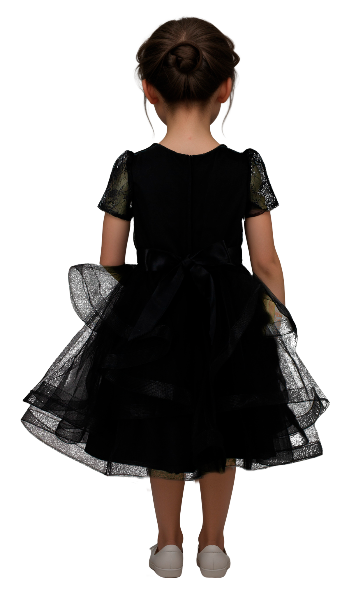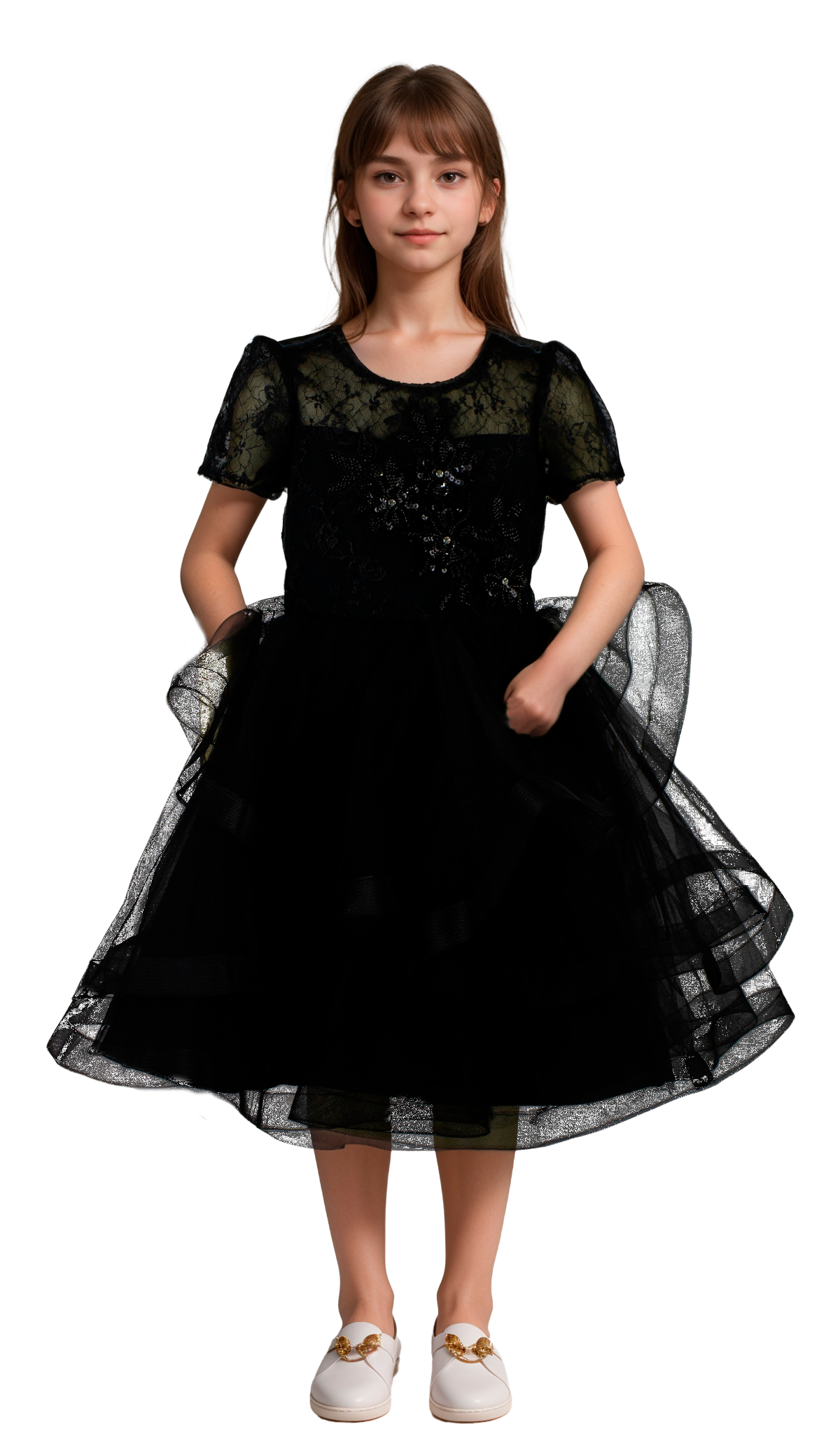 Este vestido corto para niña destaca por sus elegantes mangas de tul negras, que le aportan un toque delicado y sofisticado. Las aplicaciones bordadas en el pecho realzan el diseño, combinando estilo y detalle artesanal para una prenda única y especial. Ideal para ocasiones especiales donde se busca una apariencia refinada sin sacrificar comodidad.