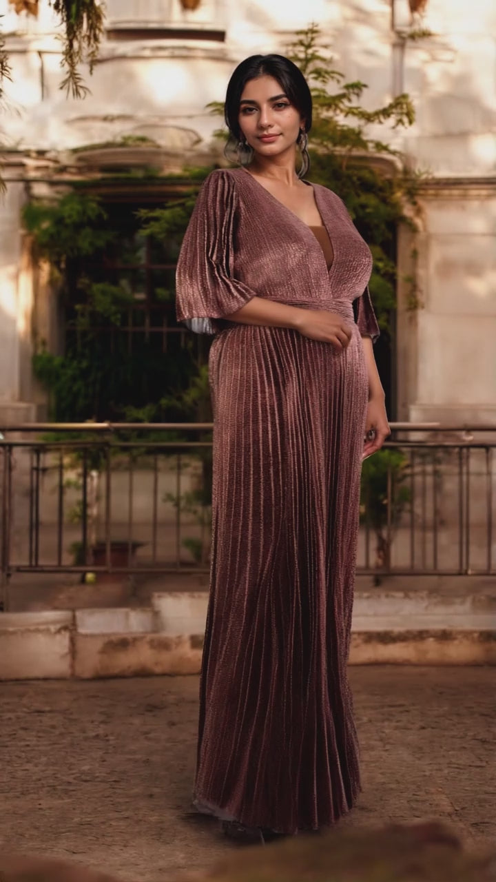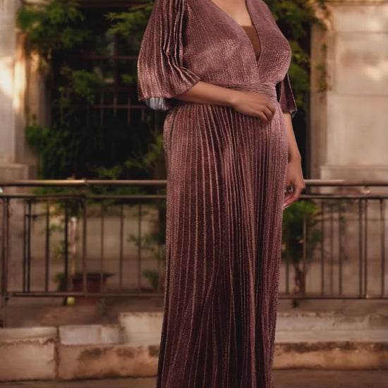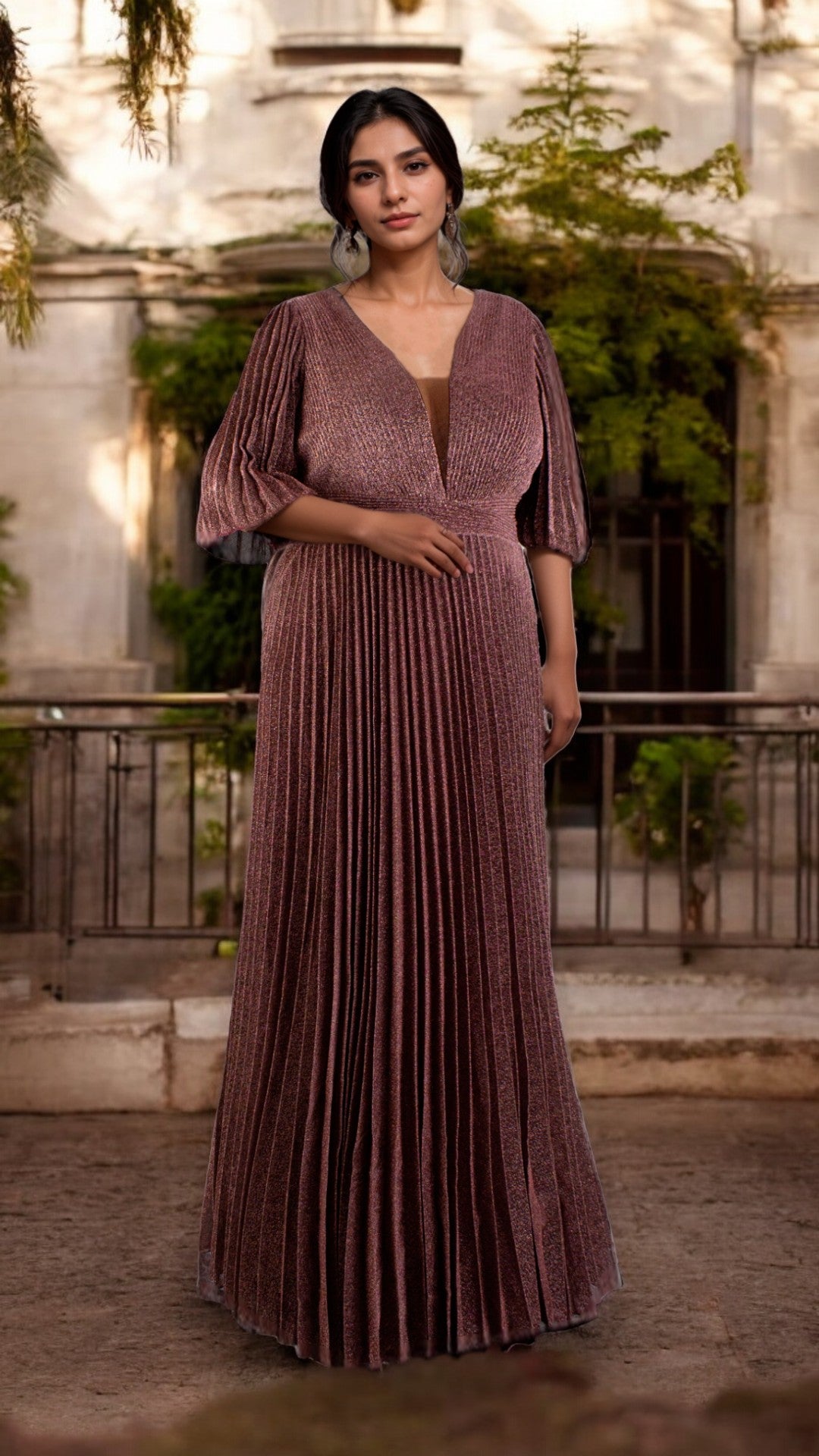 Este vestido en tono uva presenta un escote en V que favorece la silueta, complementado por mangas tres cuartos confeccionadas en tela plisada. Los detalles plateados dispersos en la prenda añaden un toque de luminosidad y sofisticación, creando una propuesta versátil apta para múltiples ocasiones que demanda atención al detalle en su confección.