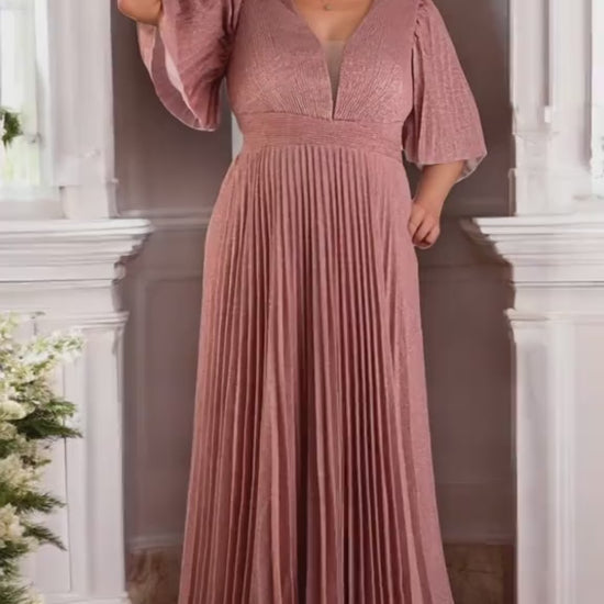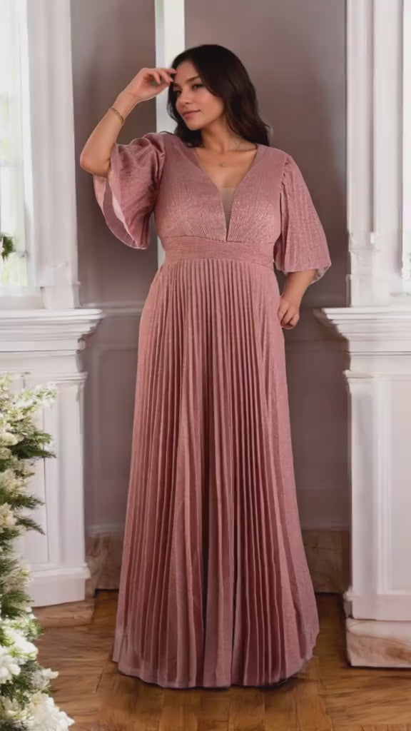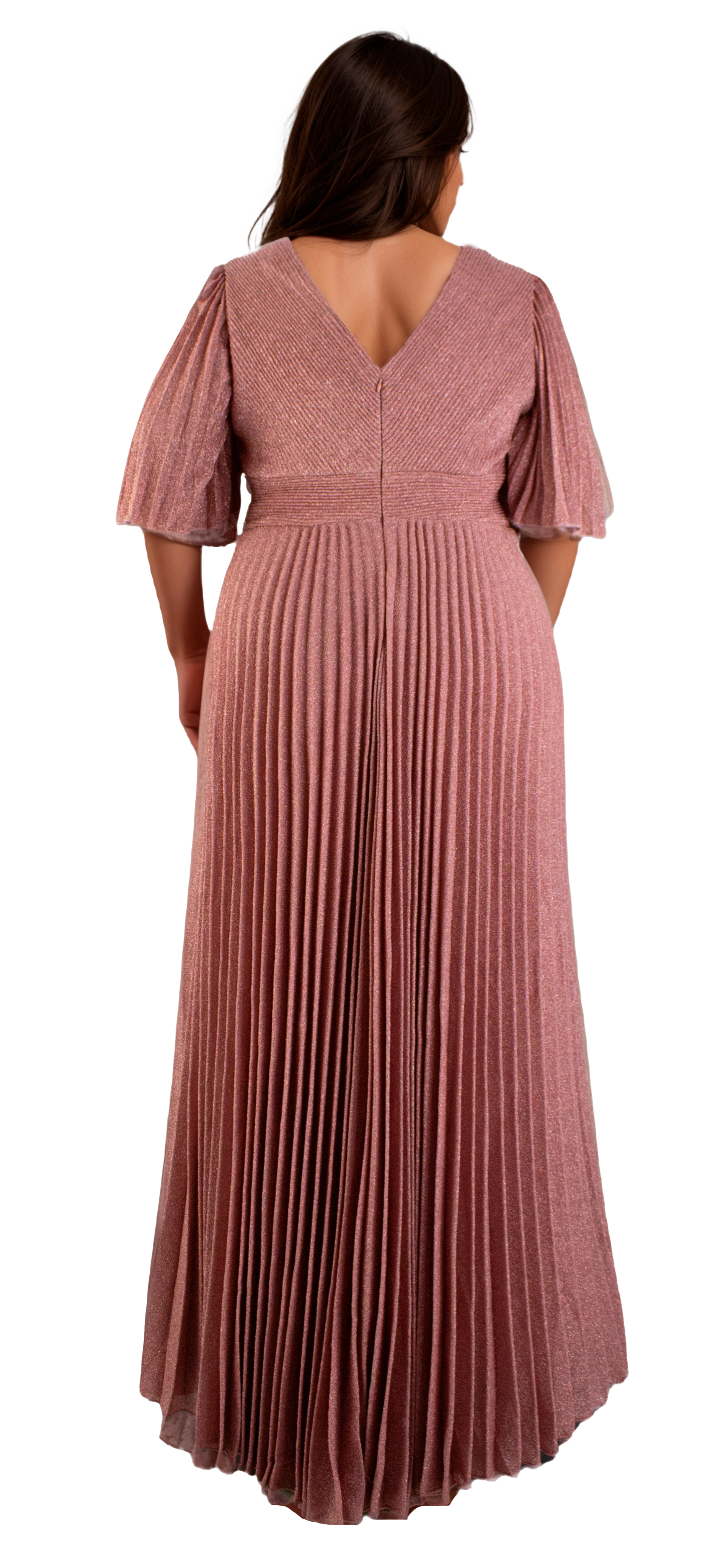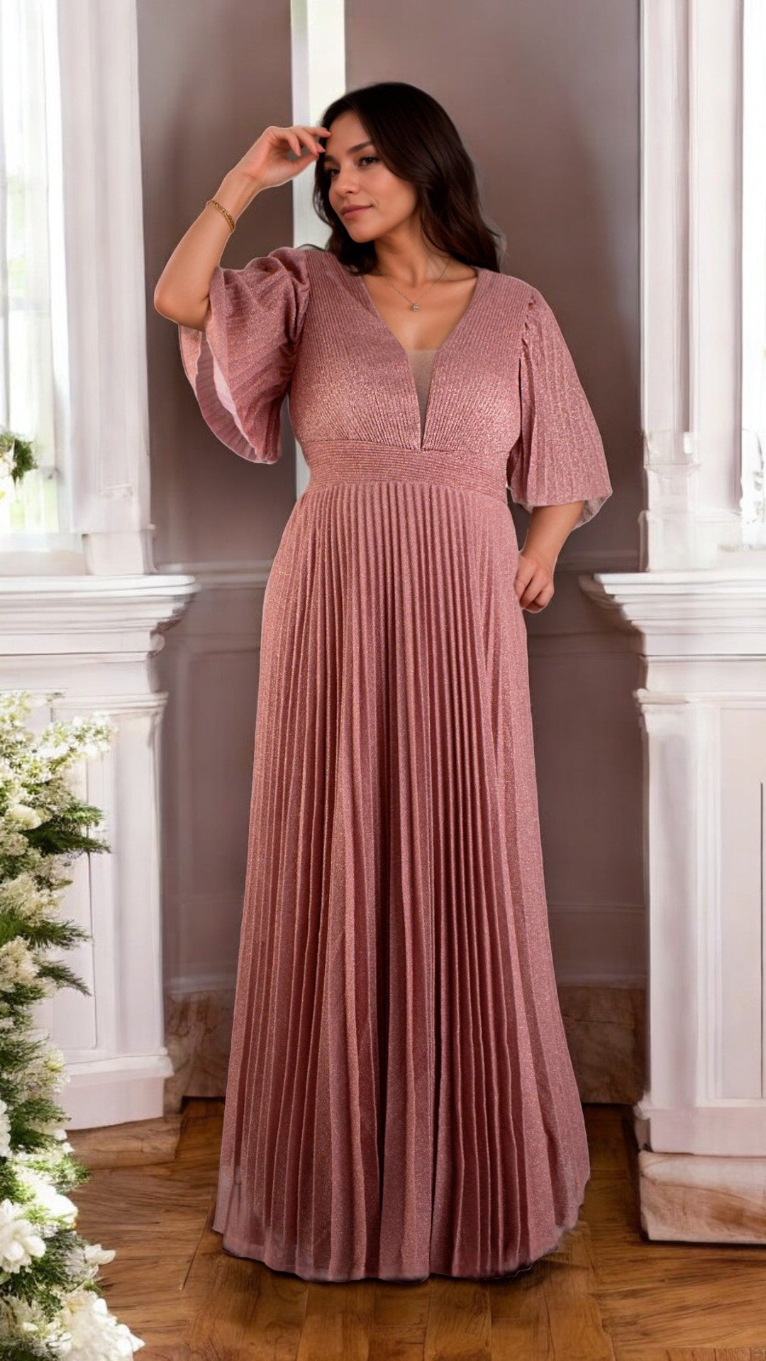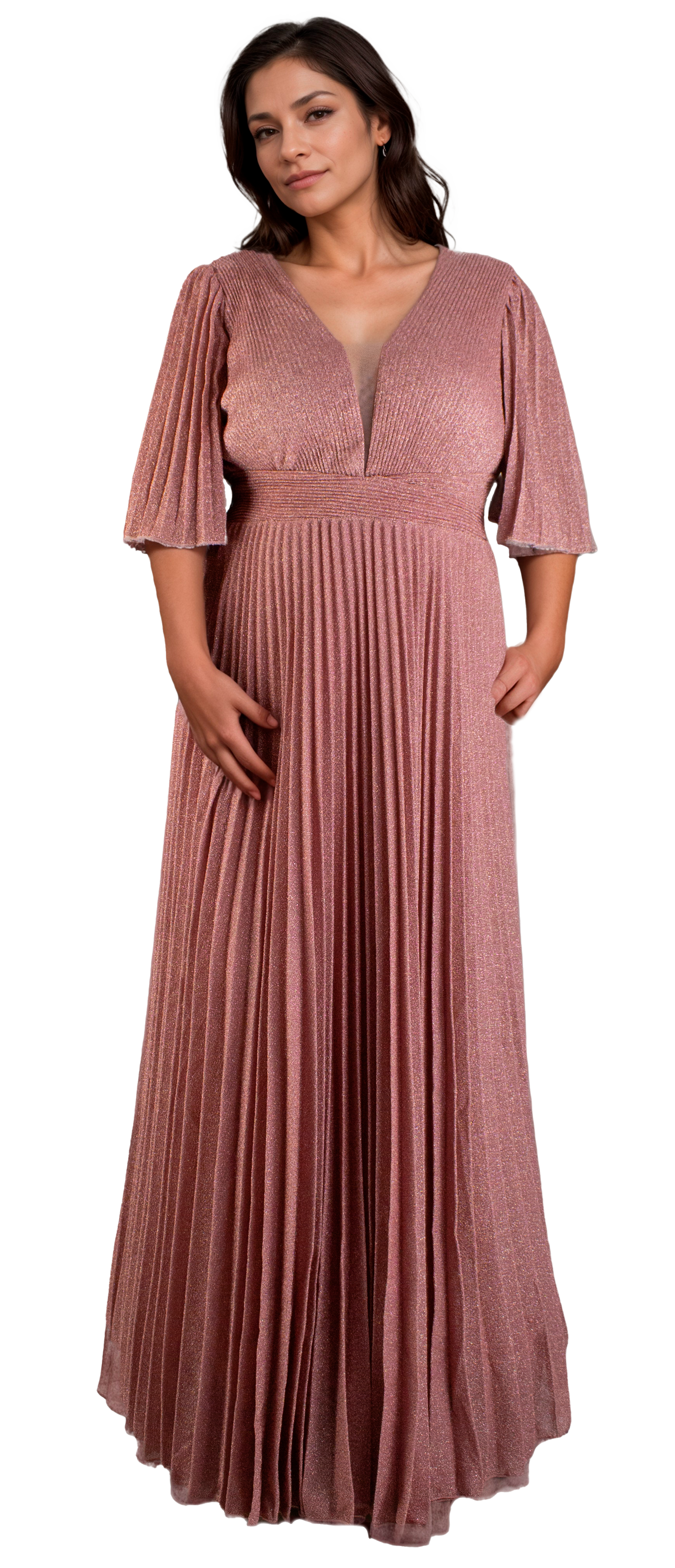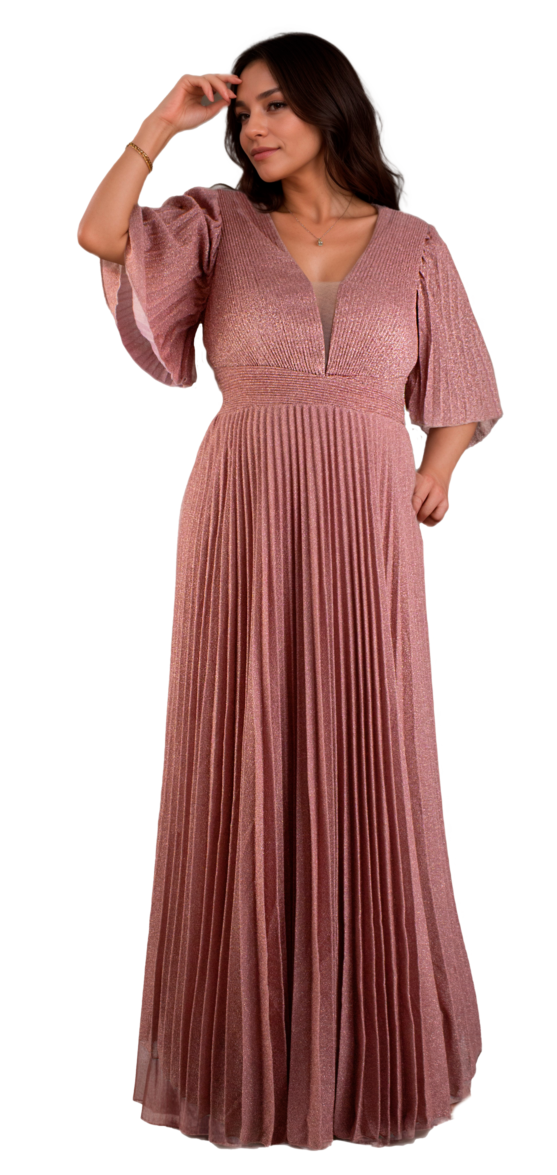Este vestido en tallas extra presenta una elegante manga 3/4 y un diseño plisado que aporta textura y movimiento. Su color rosa suave ofrece un toque femenino y sofisticado, ideal para ocasiones especiales o eventos formales. La confección cuidadosa garantiza comodidad y un ajuste favorecedor para tallas amplias.
