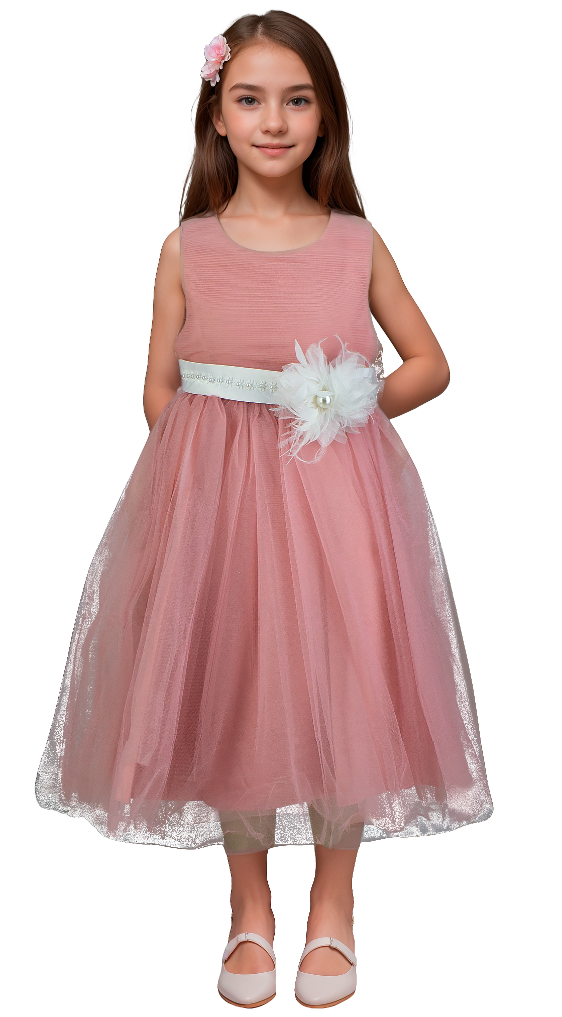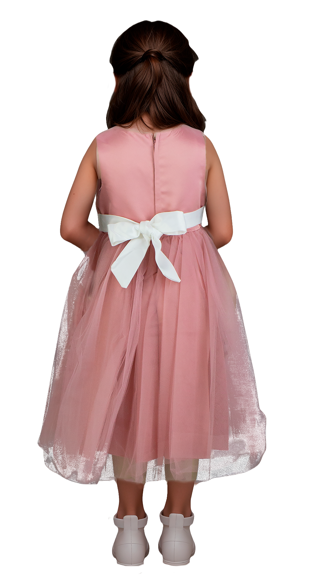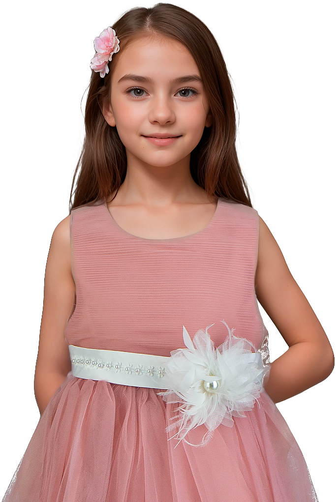 vestido de tul color rosa palo, cinturón blanco con bordado y broche decorativo