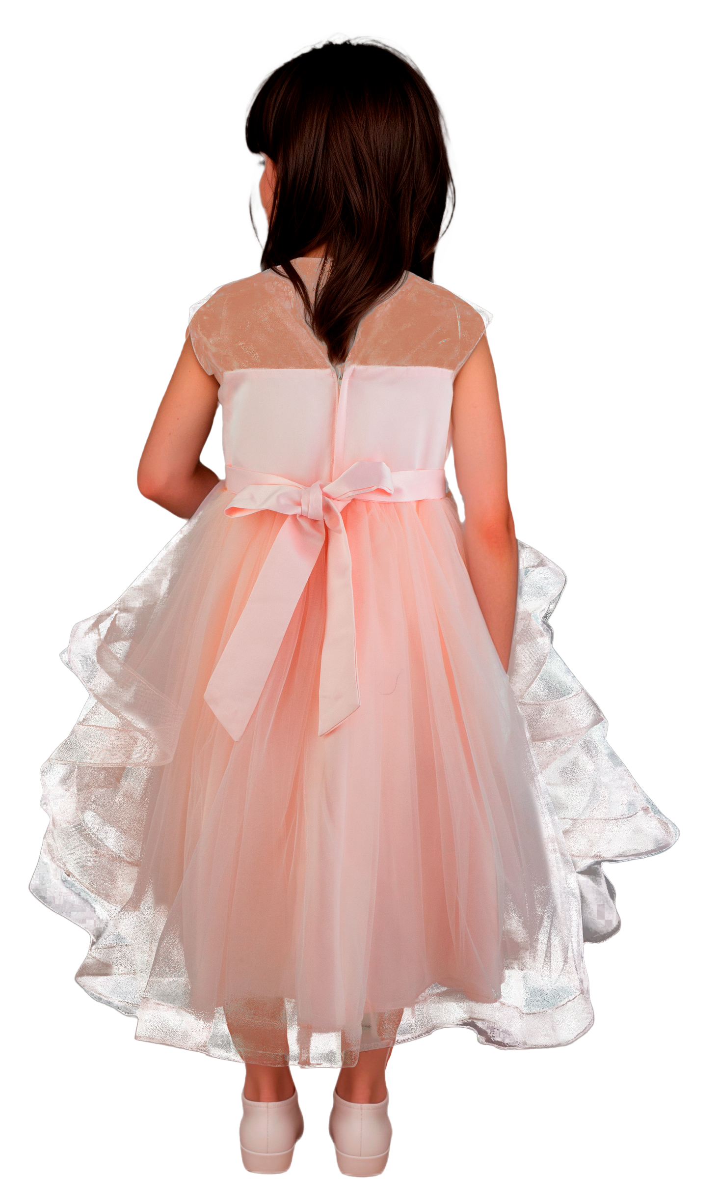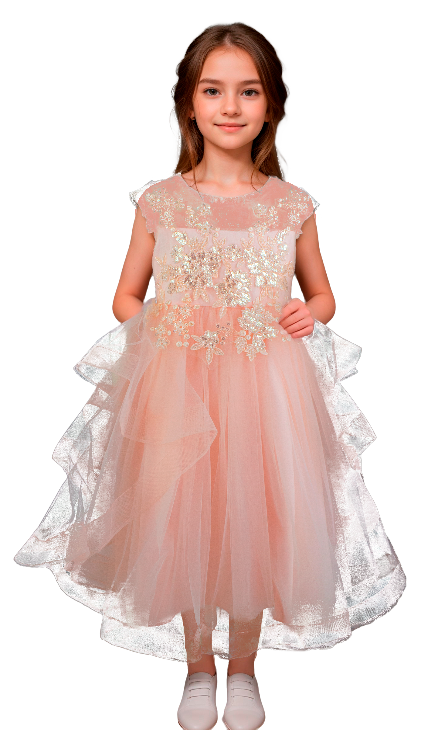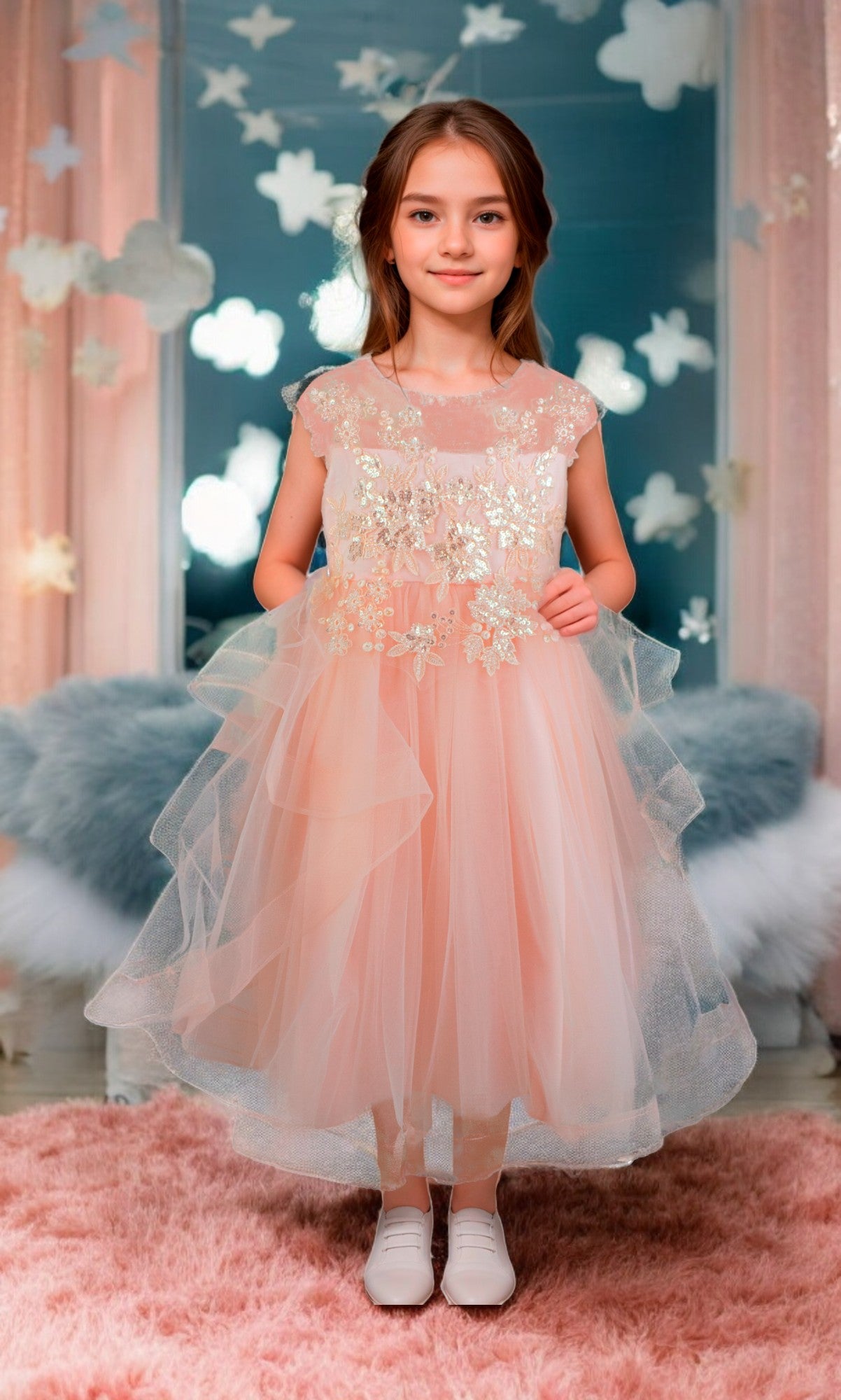 Hermoso vestido para niña largo 3/4, con aplicaciones bordadas en pecho, forrado completamente