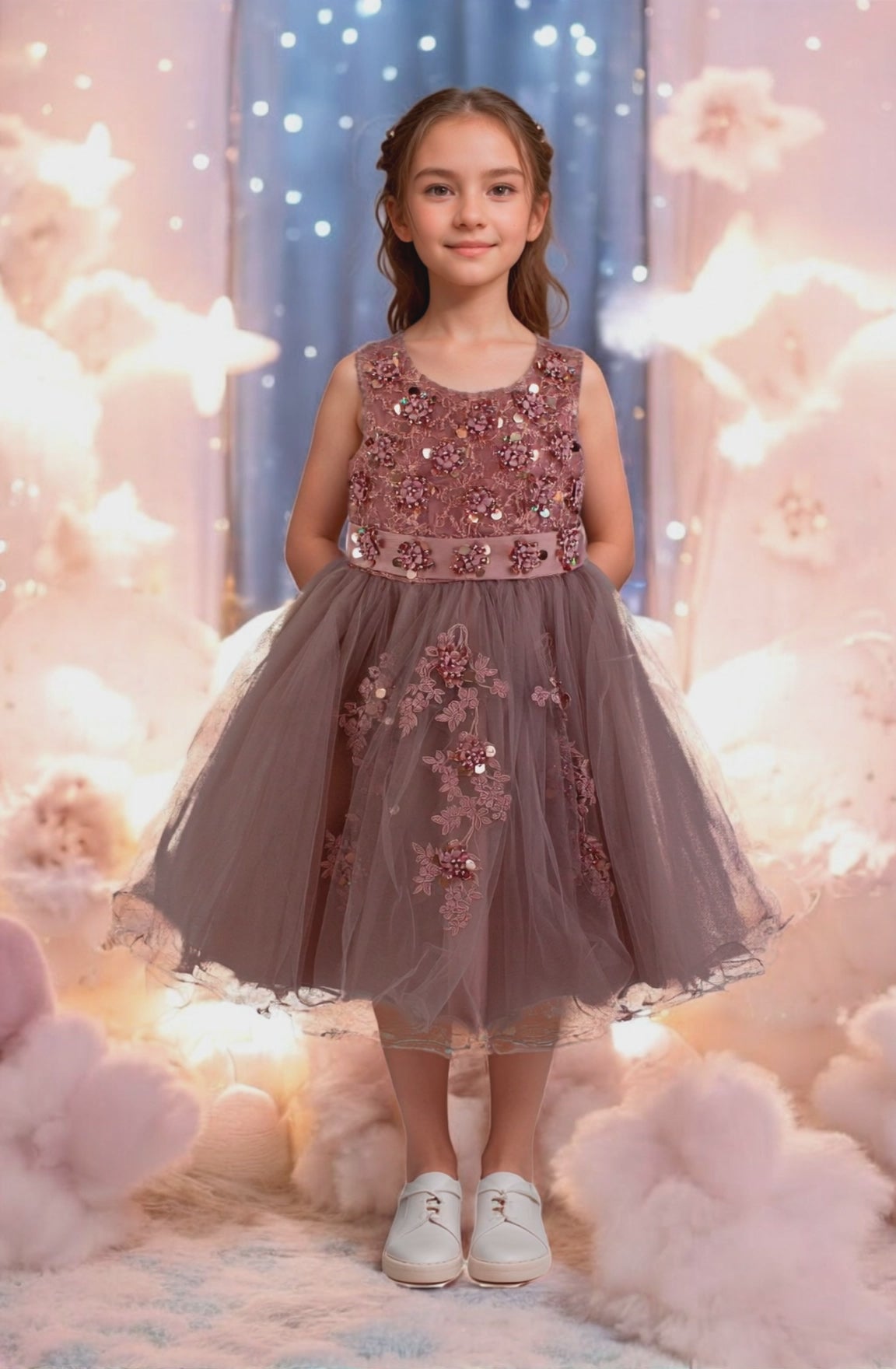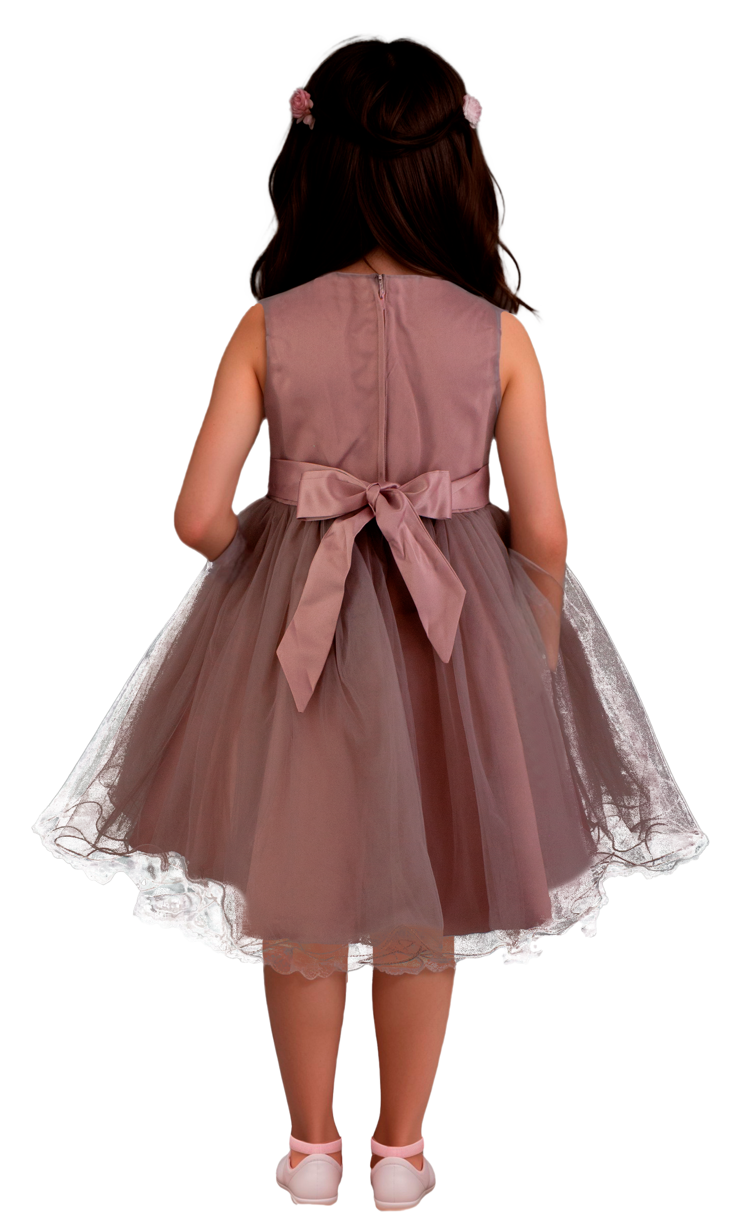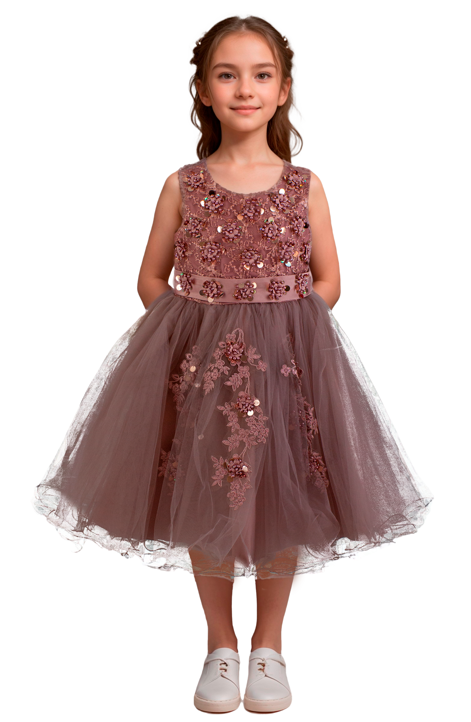 Hermoso vestido de niña corto con aplicaciones bordadas en pecho y falda de tul