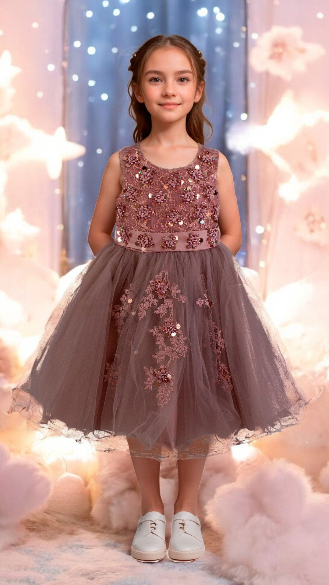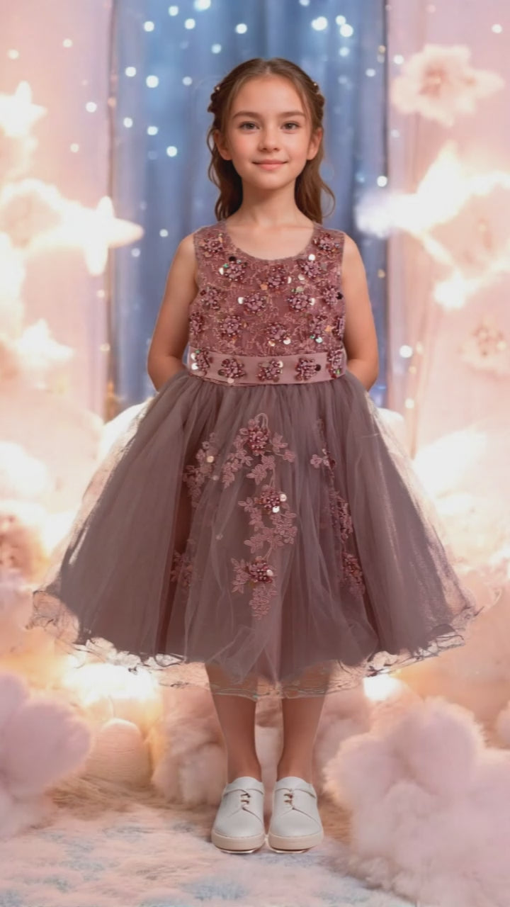 Delicado vestido infantil de corte clásico, realzado con refinadas aplicaciones bordadas en el pecho y una falda de tul que añade movimiento y elegancia. Diseñado para ocasiones especiales, combina detalles artesanales con comodidad, permitiendo que la pequeña se sienta segura y radiante en cada evento.