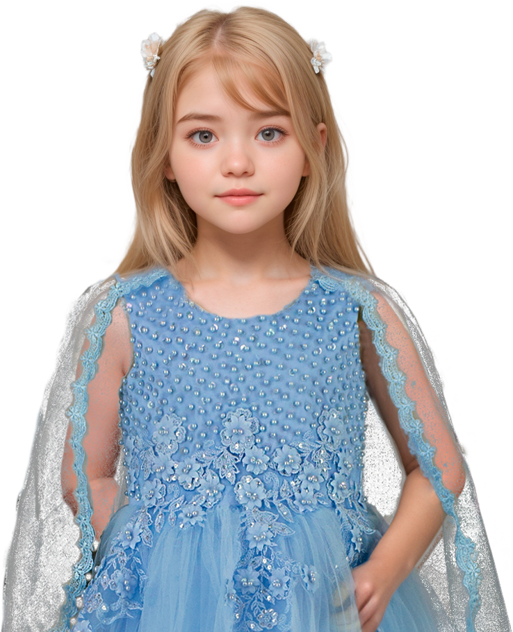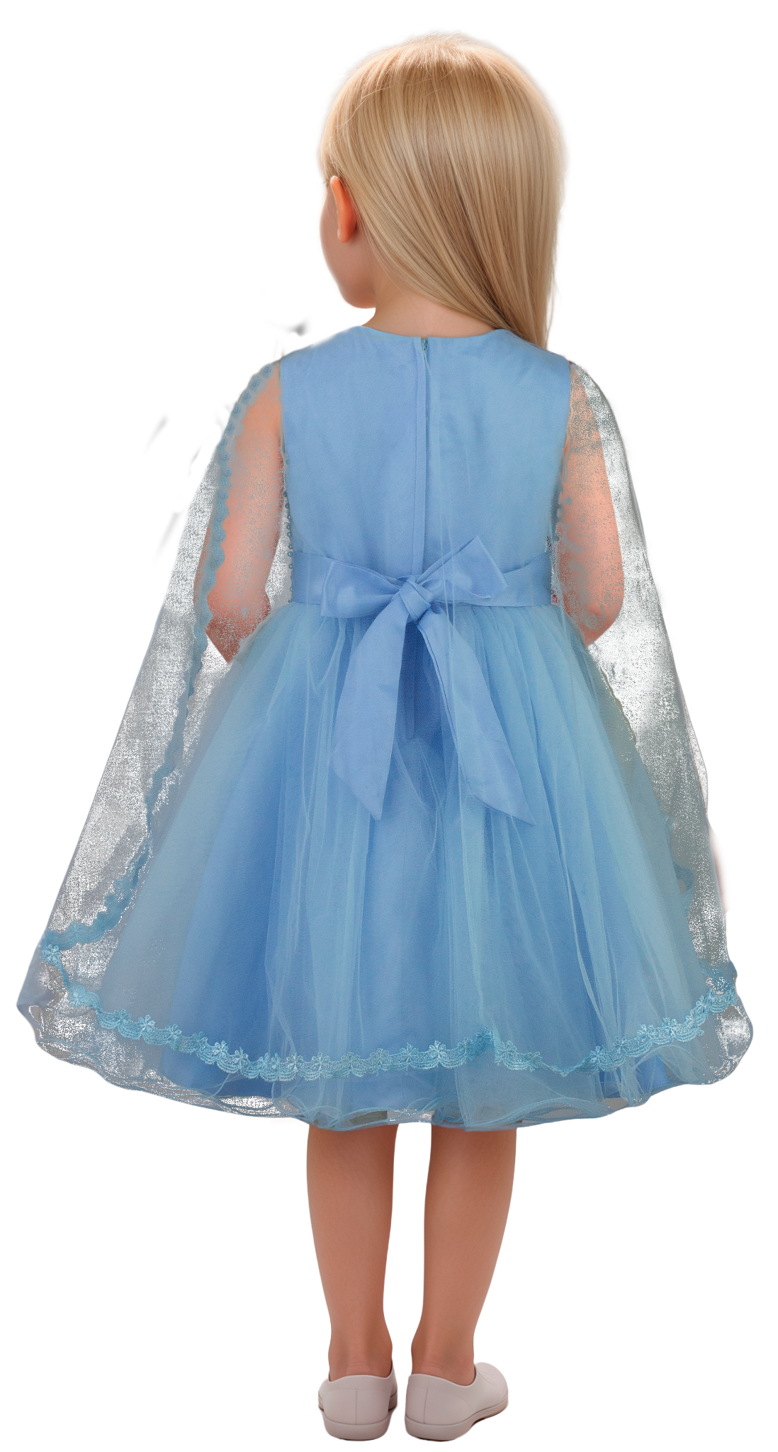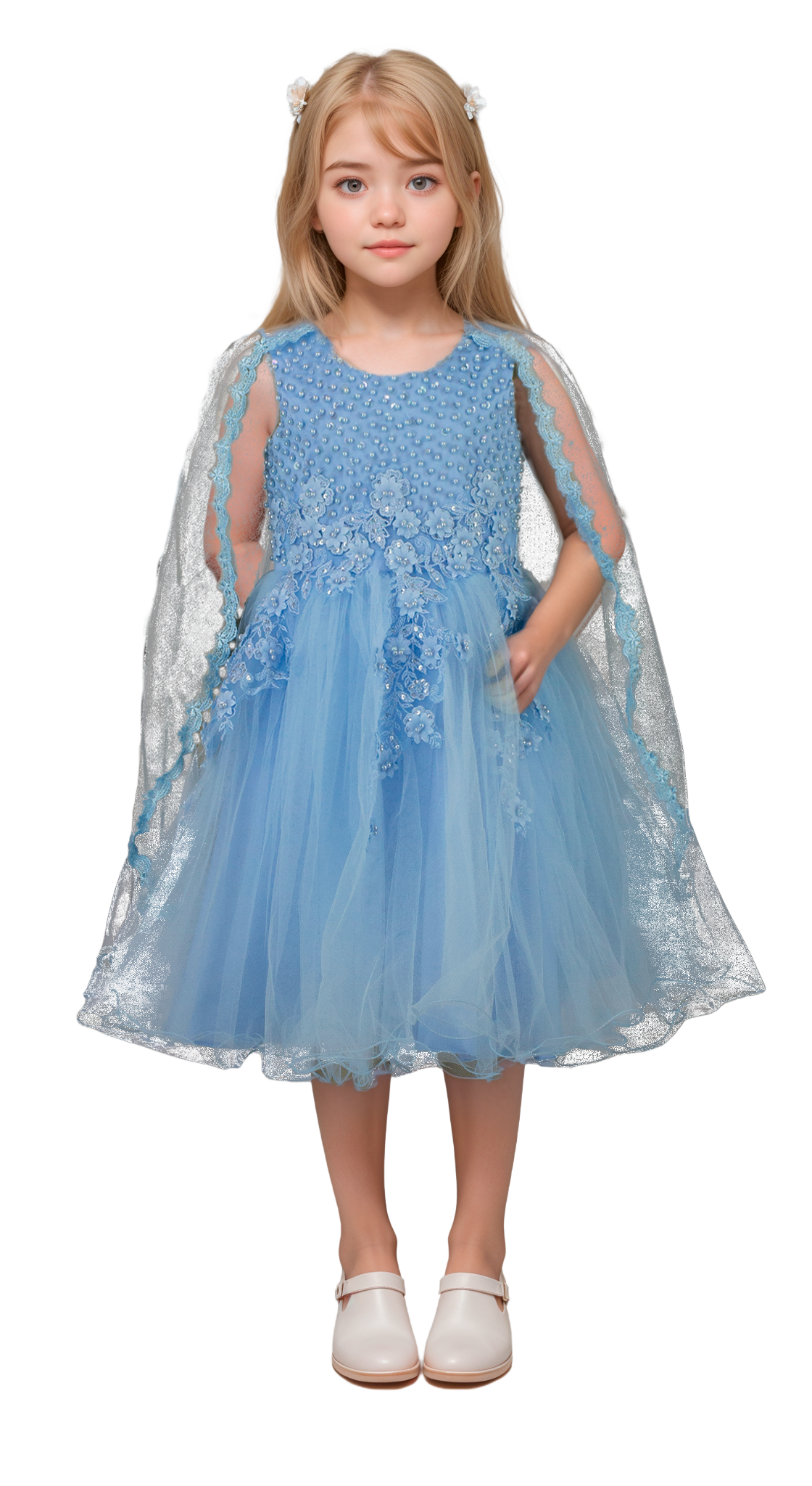 Este vestido corto para niña en azul cielo destaca por su cómoda capa y el delicado bordado con aplicaciones en el pecho, que le aportan un toque elegante y detallado. Ideal para ocasiones especiales, combina estilo y comodidad para que las más pequeñas luzcan sofisticadas y a gusto.