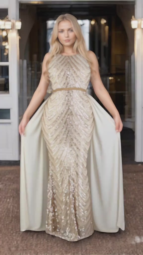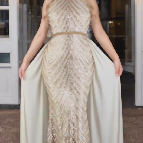 Vestido de fiesta de corte sirena confeccionado en lentejuelas, diseñado con sobrefalda que añade movimiento y elegancia. Ideal para ocasiones especiales donde se busca un look sofisticado y de impacto visual.