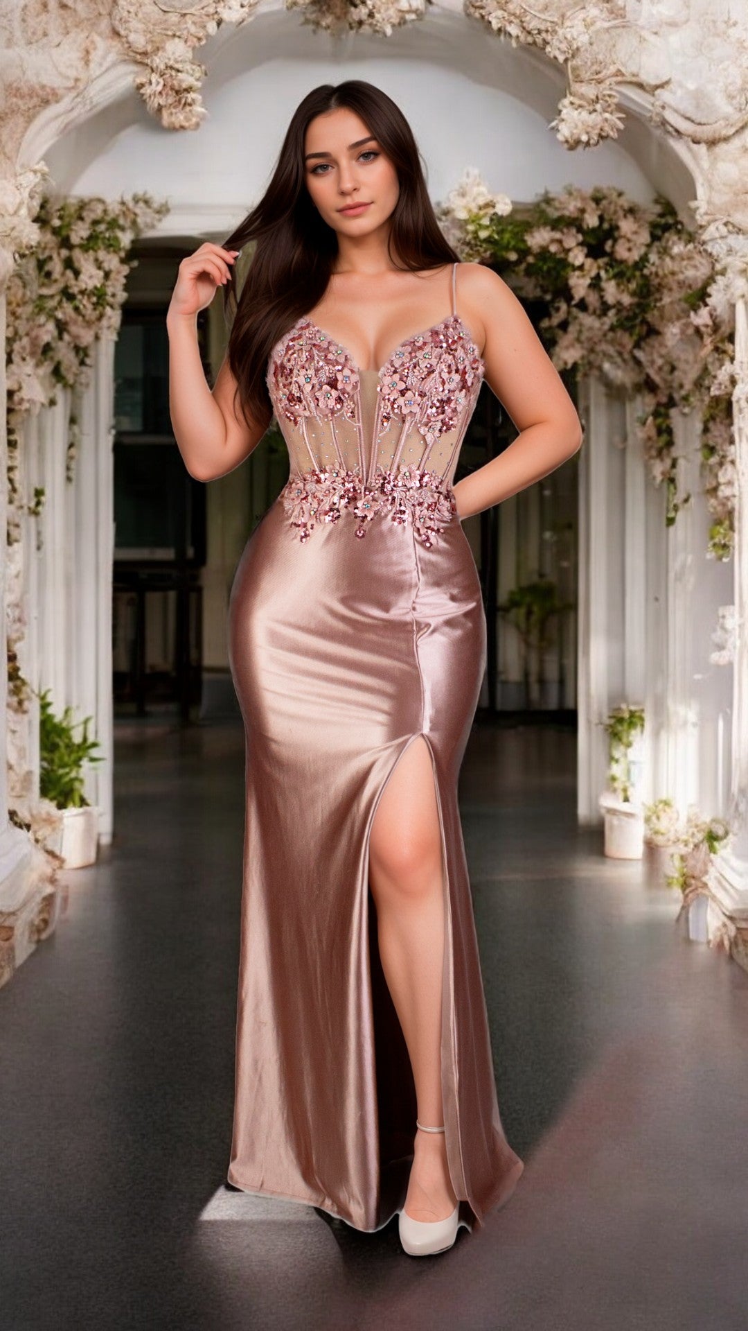 Vestido tirantes finos color rosa palo, corte sirena