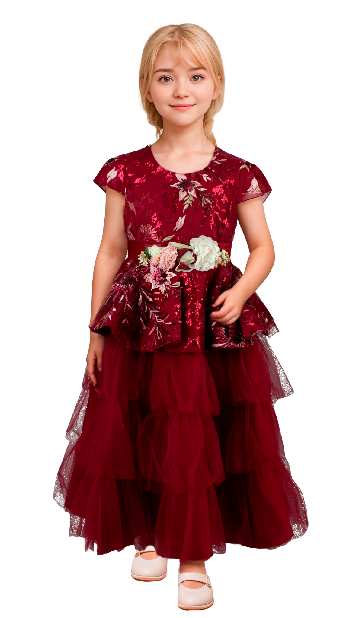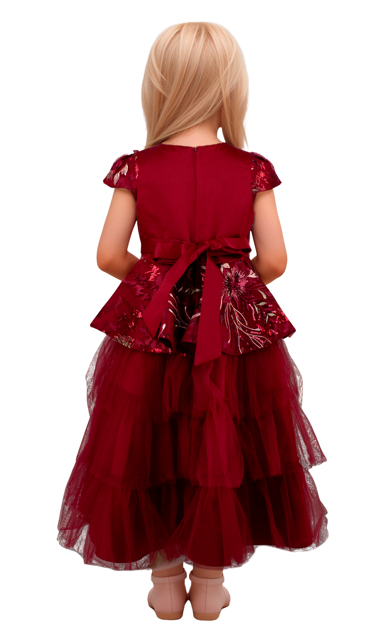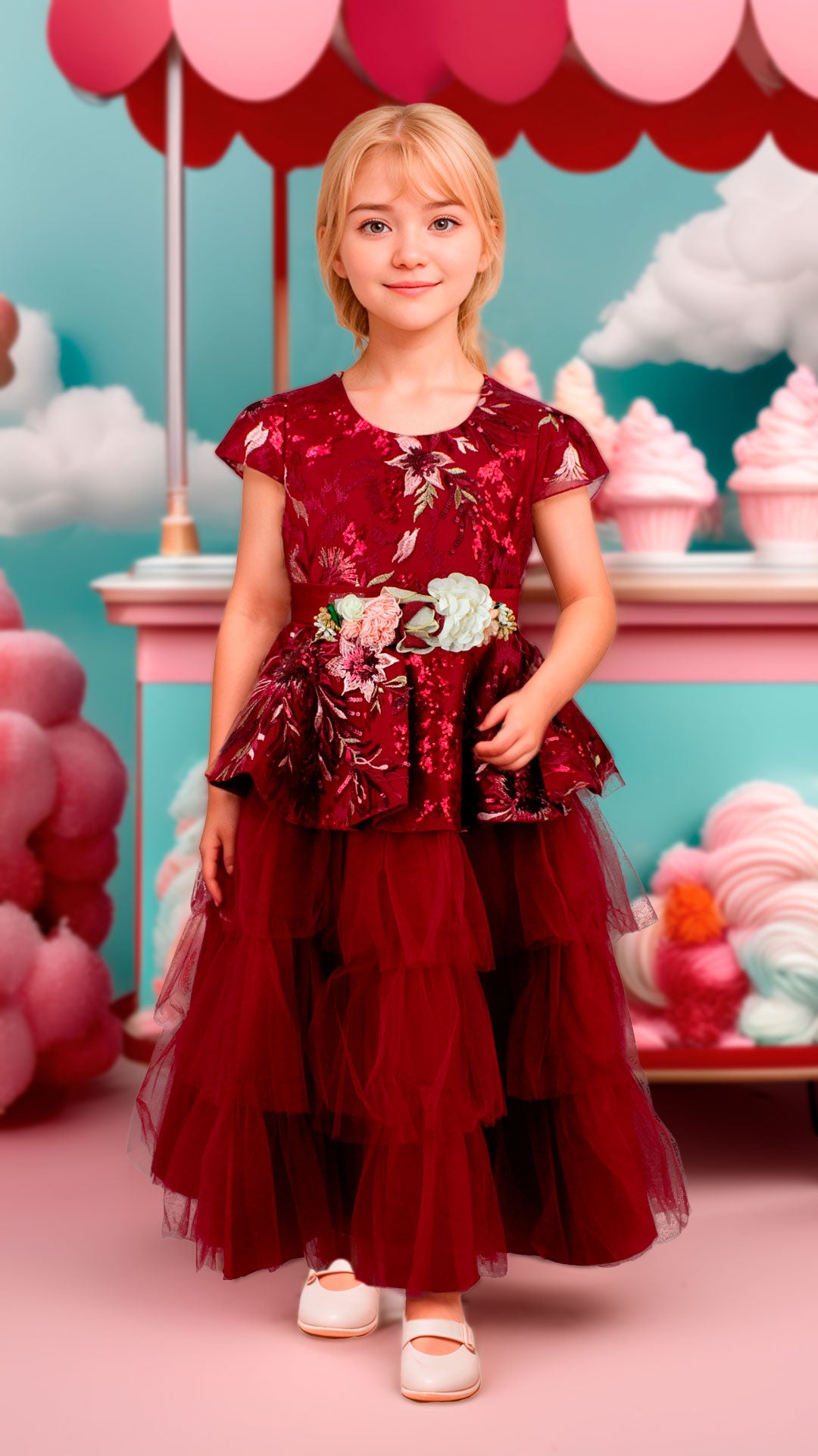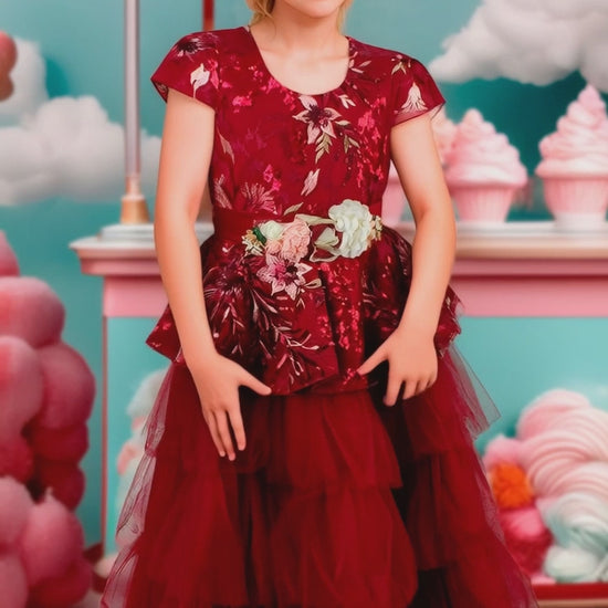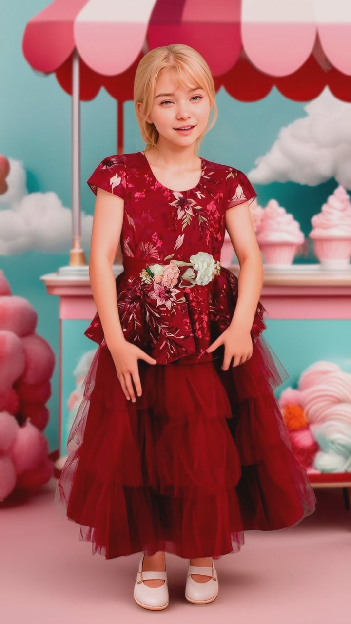 Elegante vestido en tonalidad vino, enriquecido con delicados bordados y mangas que proporcionan movimiento. Falda voluminosa confeccionada en tul que crea una silueta sofisticada, complementada con un broche estratégicamente colocado en la cintura para definir la figura.
