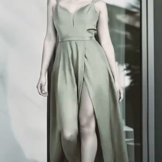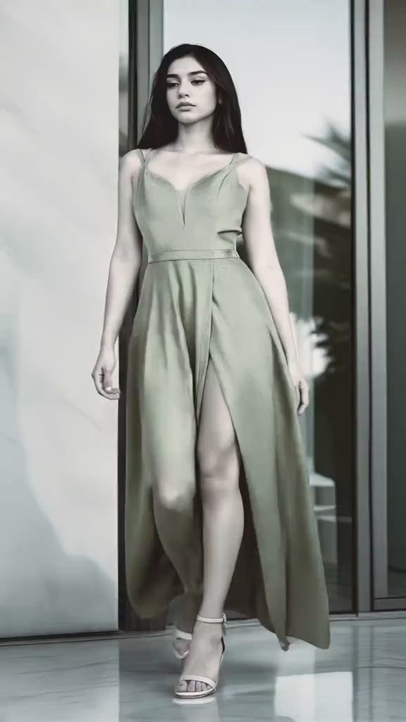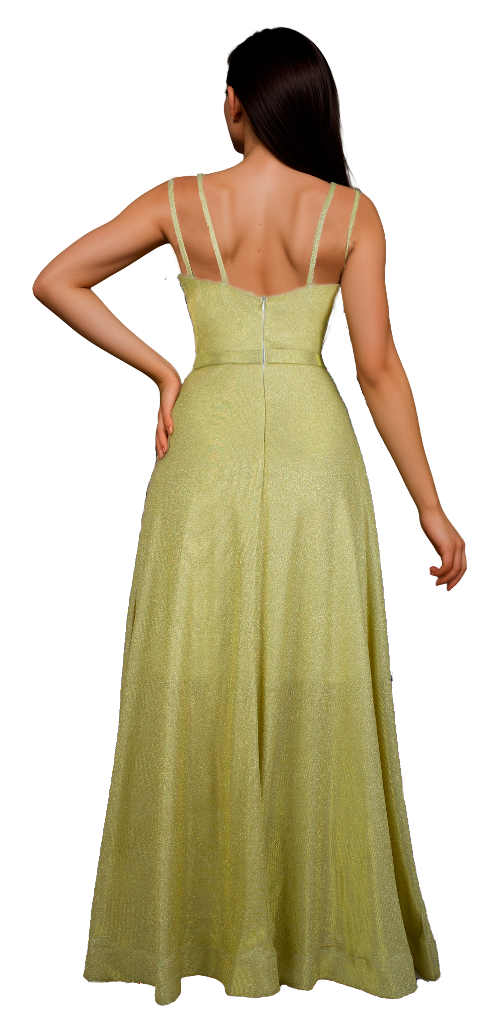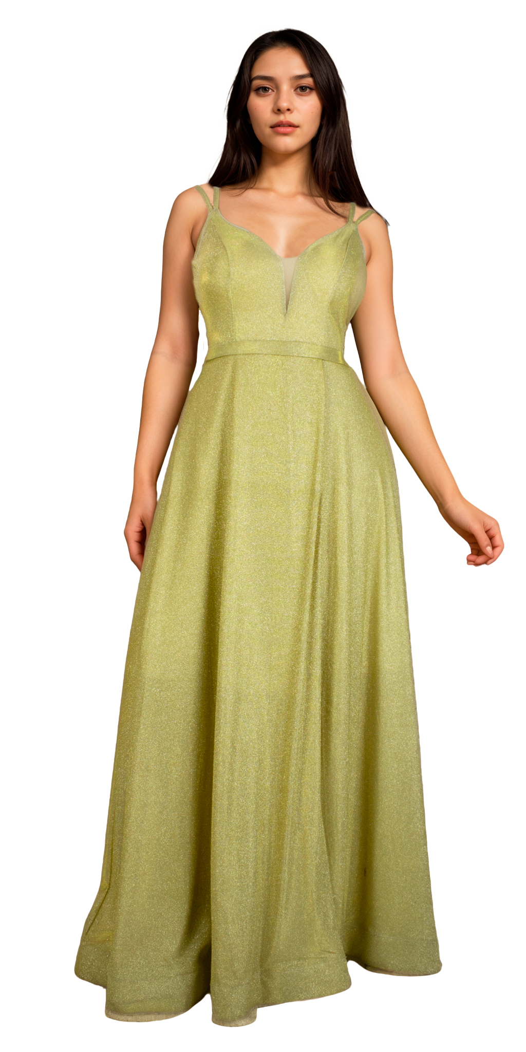 Este vestido dorado presenta un elegante escote en V y un favorecedor corte princesa que realza la figura. Su abertura en la pierna añade un toque sofisticado y moderno, mientras que la tela con glitter y destellos plateados aporta un brillo sutil y refinado, ideal para ocasiones especiales donde se busca destacar con estilo y distinción.