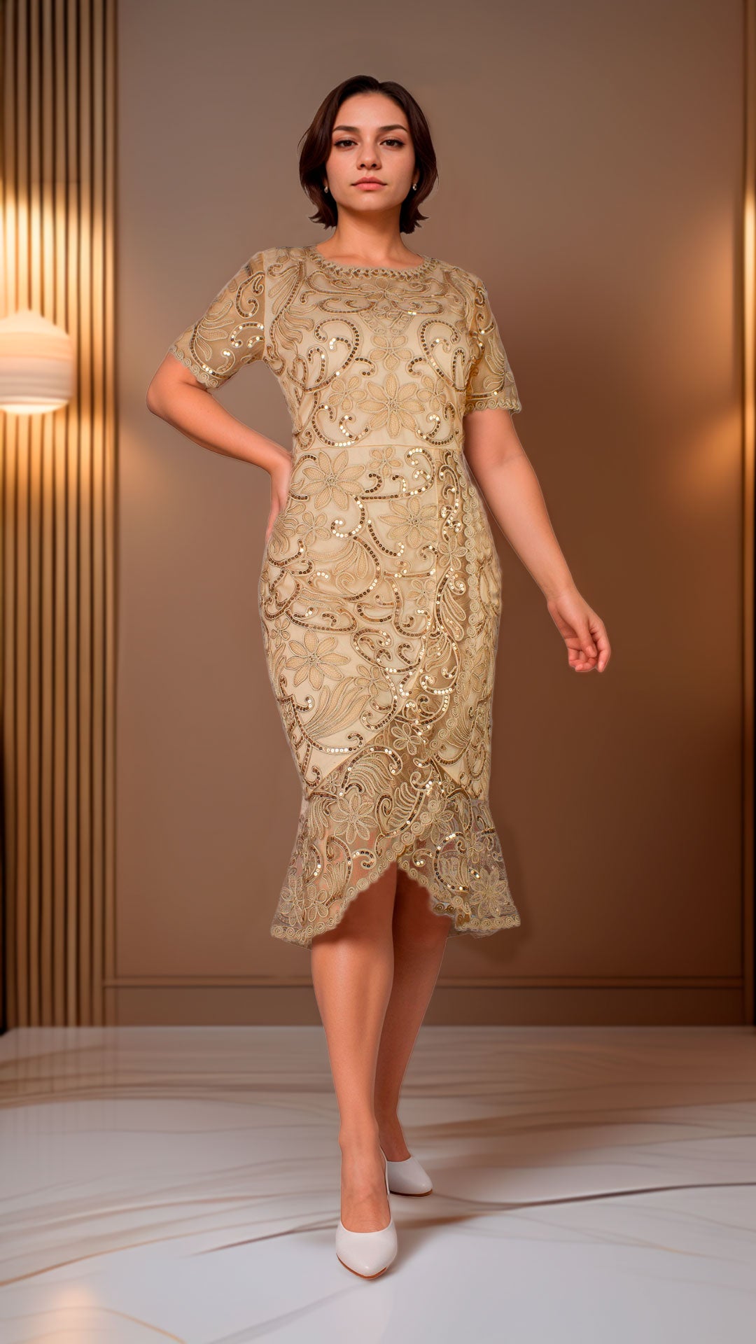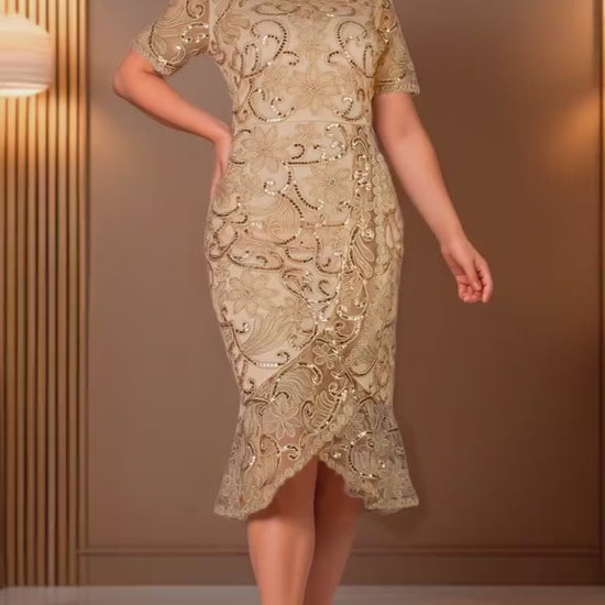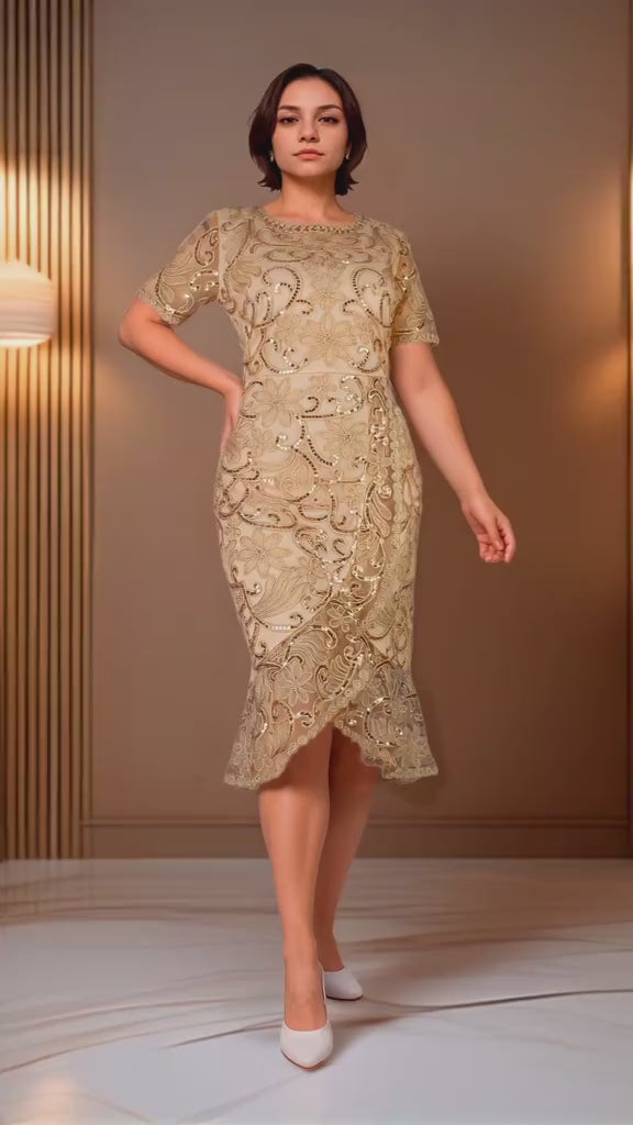Este vestido dorado de manga corta combina elegancia y sofisticación en un diseño impecable. Su acabado luminoso realza cualquier ocasión formal, mientras que la manga corta proporciona comodidad y libertad de movimiento. Perfecto para quienes buscan un