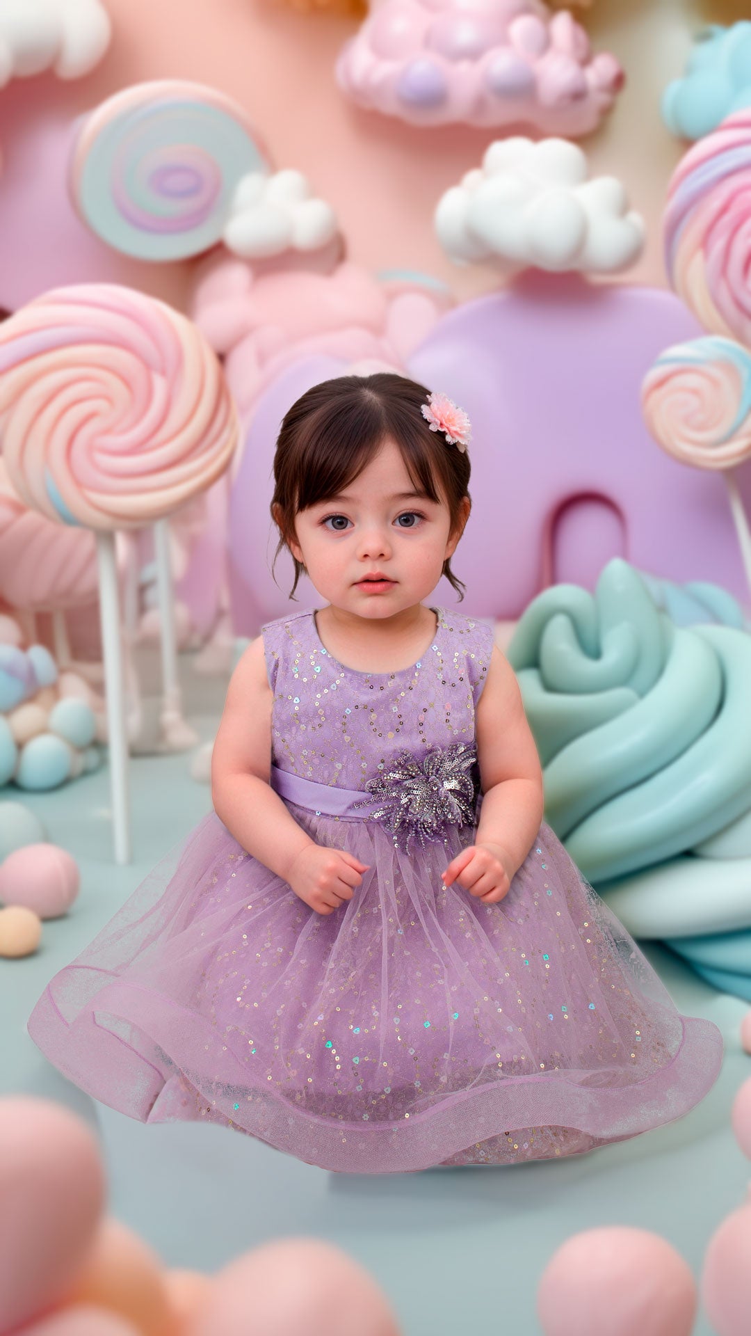 Este vestido para bebé en color lila combina delicadeza y elegancia. Su cintura luce una aplicación de pedrería que realza el diseño, mientras que el tul bordado con lentejuela dorada aporta un brillo sutil y sofisticado. Ideal para ocasiones especiales, ofrece confort y estilo en una prenda cuidadosamente elaborada.
