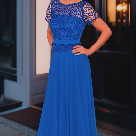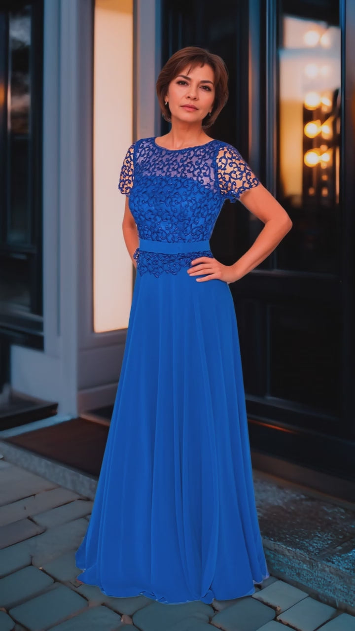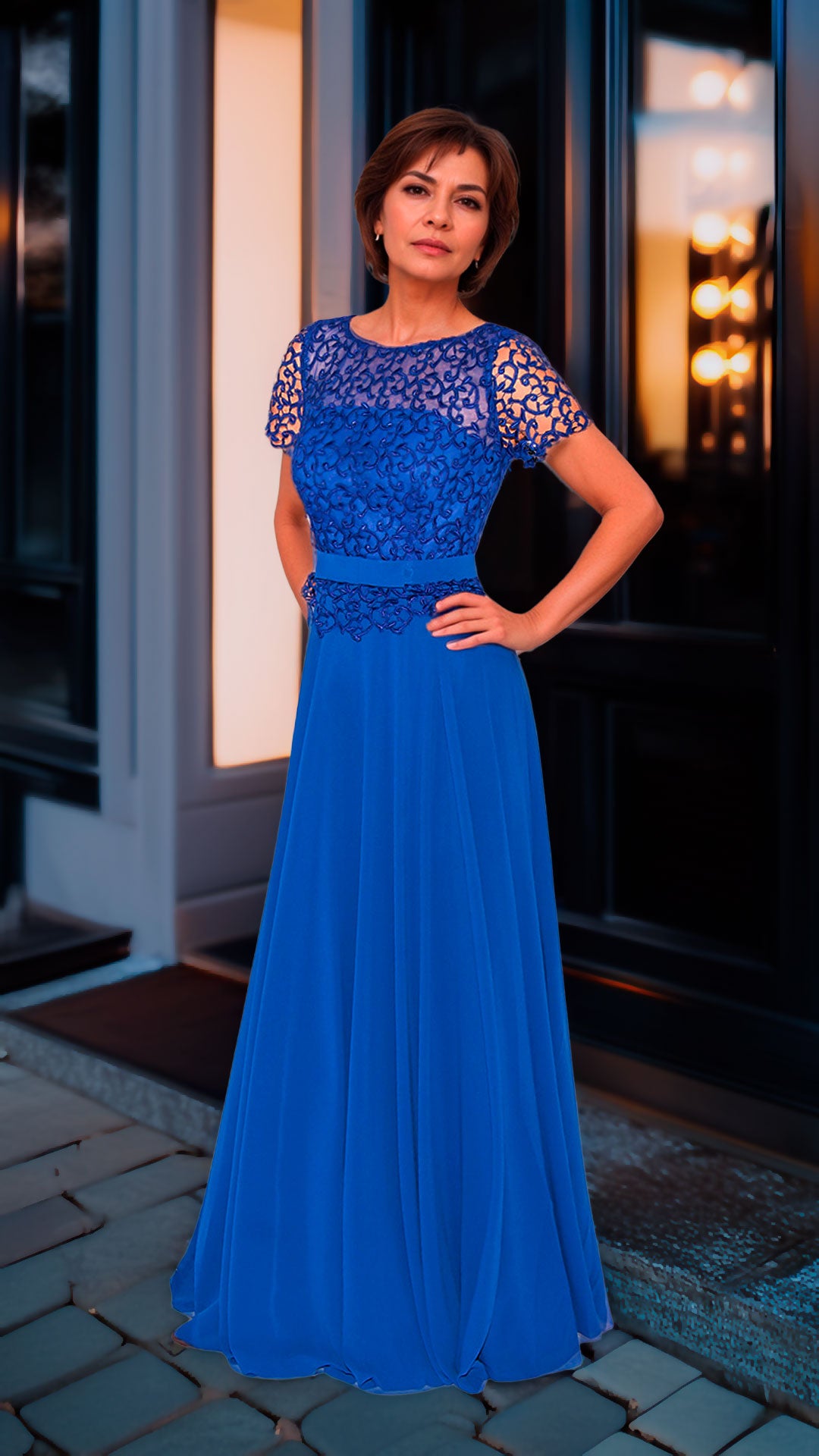 Sofisticado vestido de largo con mangas cortas y cuello redondo, diseñado con corte princesa que realza la silueta. La falda en chiflón flota elegantemente, mientras que el forro interior garantiza comodidad y durabilidad. Una pieza versátil para ocasiones especiales.