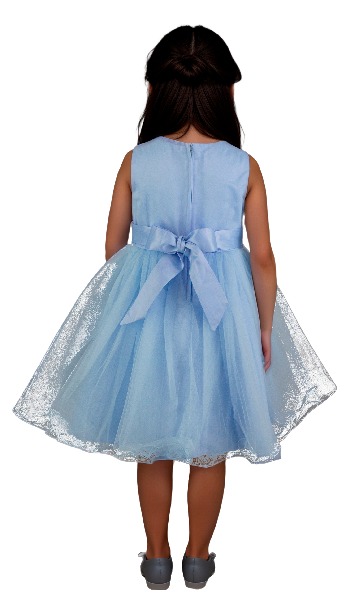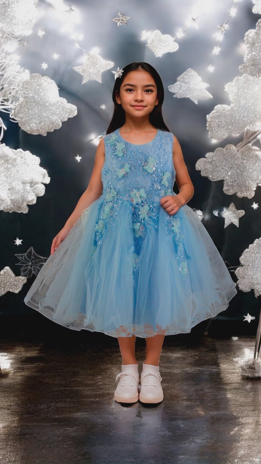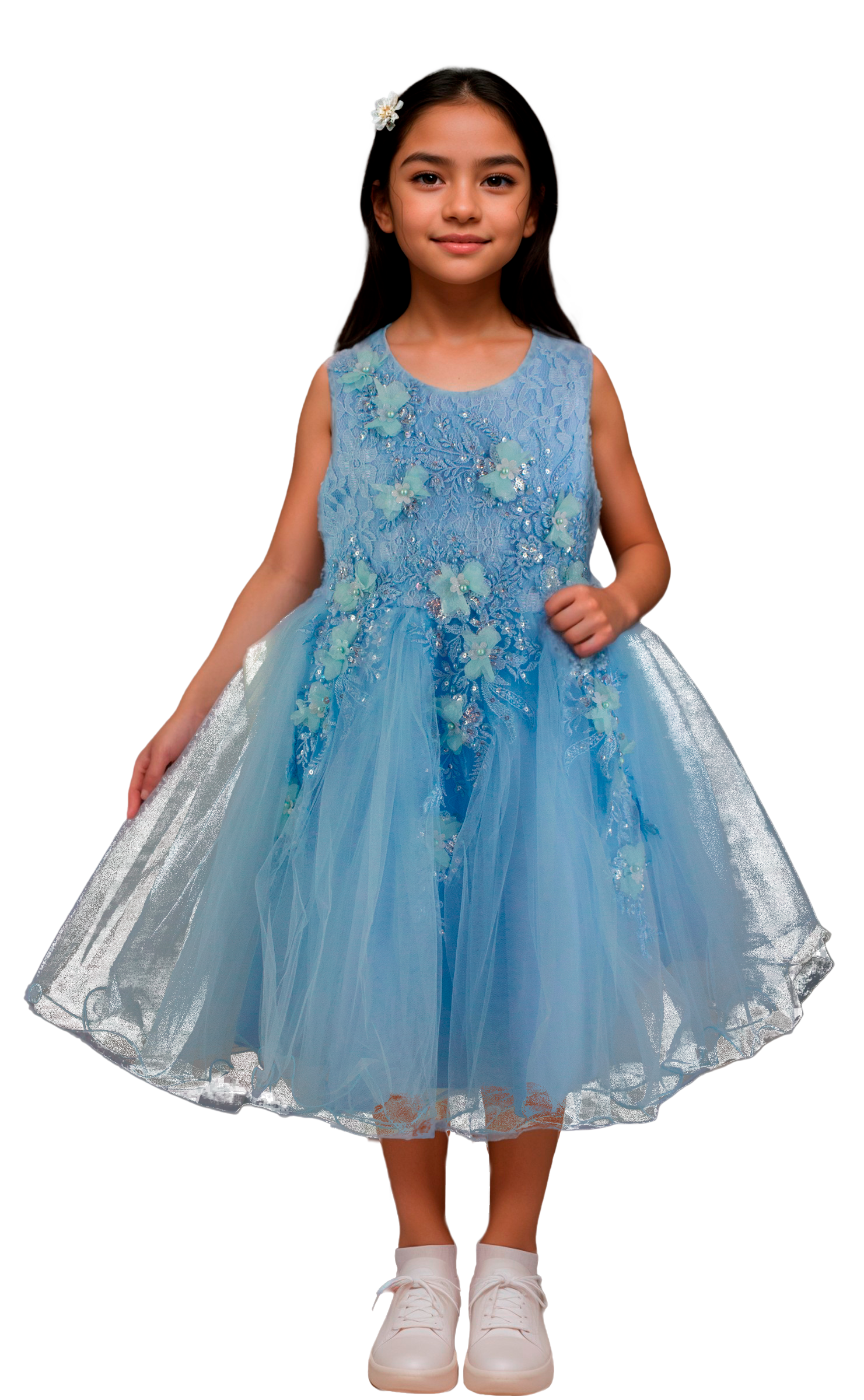 Hermoso vestido de niña corto con aplicaciones bordadas en pecho y falda de tul