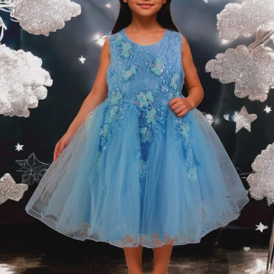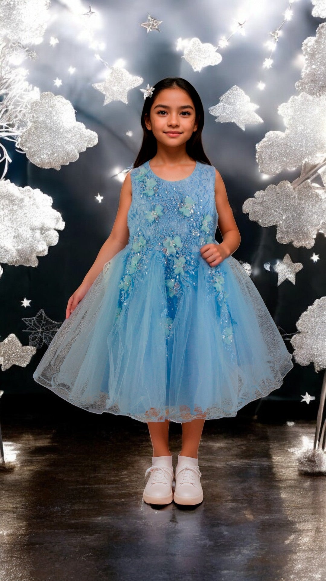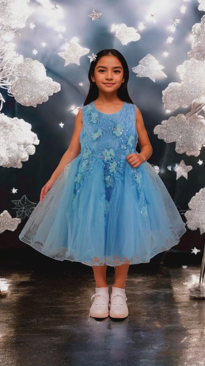 Delicado vestido infantil de corte breve, distinguido por sus refinadas aplicaciones bordadas en el pecho y una falda de tul que añade movimiento y elegancia. Diseñado para ocasiones especiales, combina detalles artesanales con una silueta moderna que favorece la comodidad de la niña.