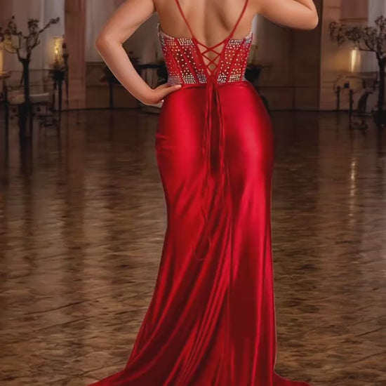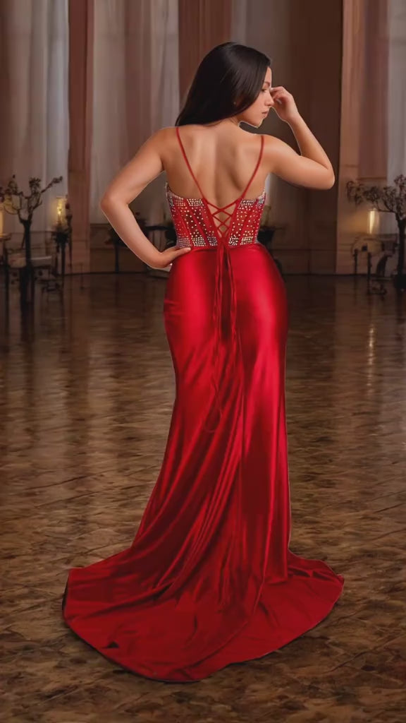 Elegante vestido de noche en rojo intenso que combina sofisticación y movimiento. Diseñado con corsé estructurado y detalles de transparencia realzados por aplicaciones de cristal que capturan la luz. El drapeado estratégico y la abertura en la pierna proporcionan elegancia y comodidad, mientras que el corte sirena entallado y la cauda alargada crean una silueta dramática y envolvente, perfecta para eventos de gala.
