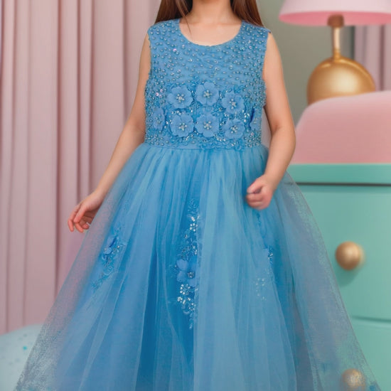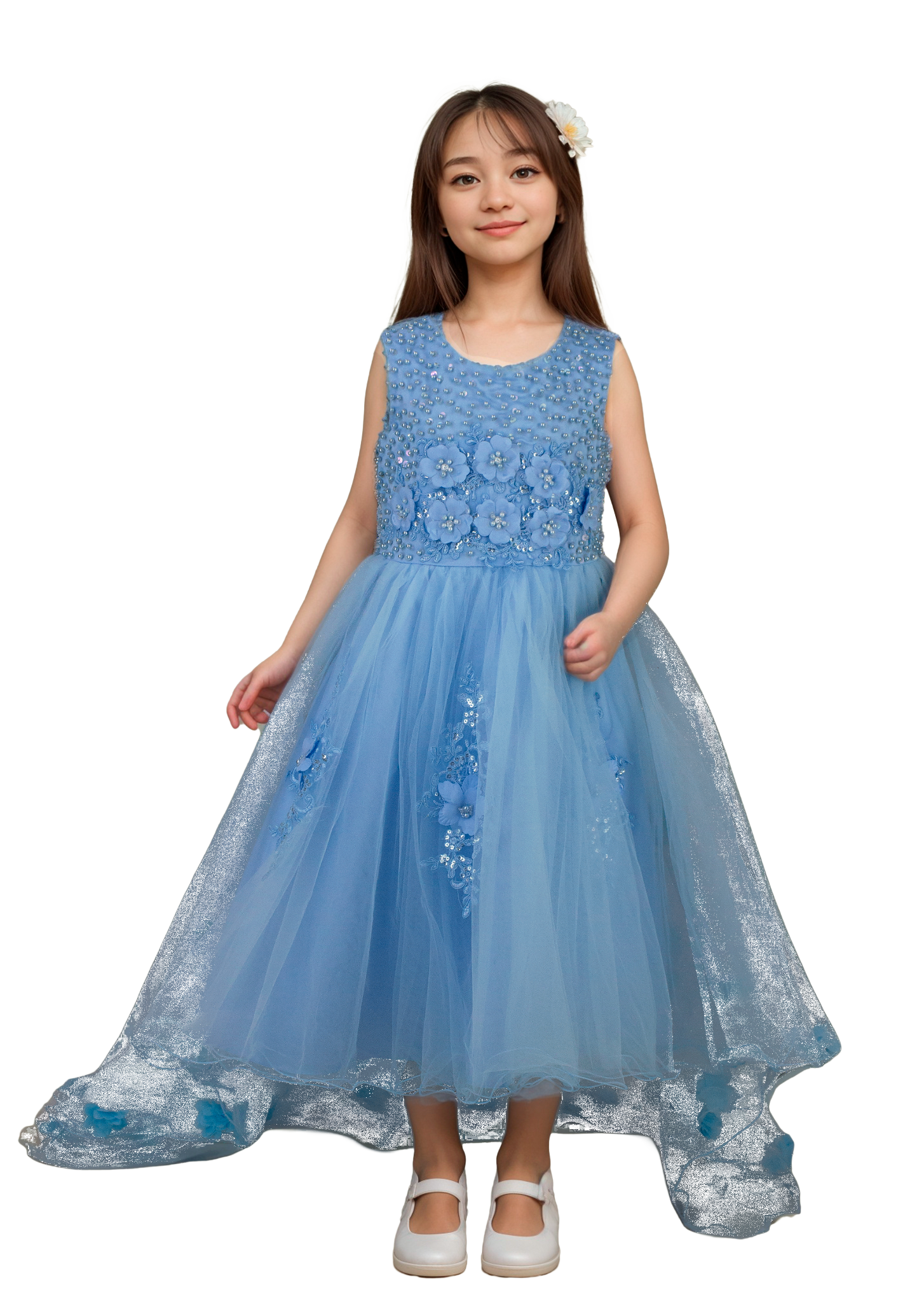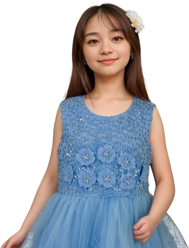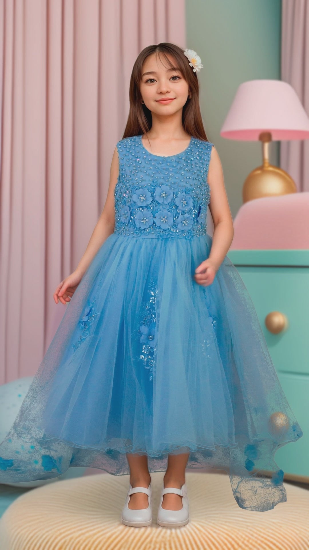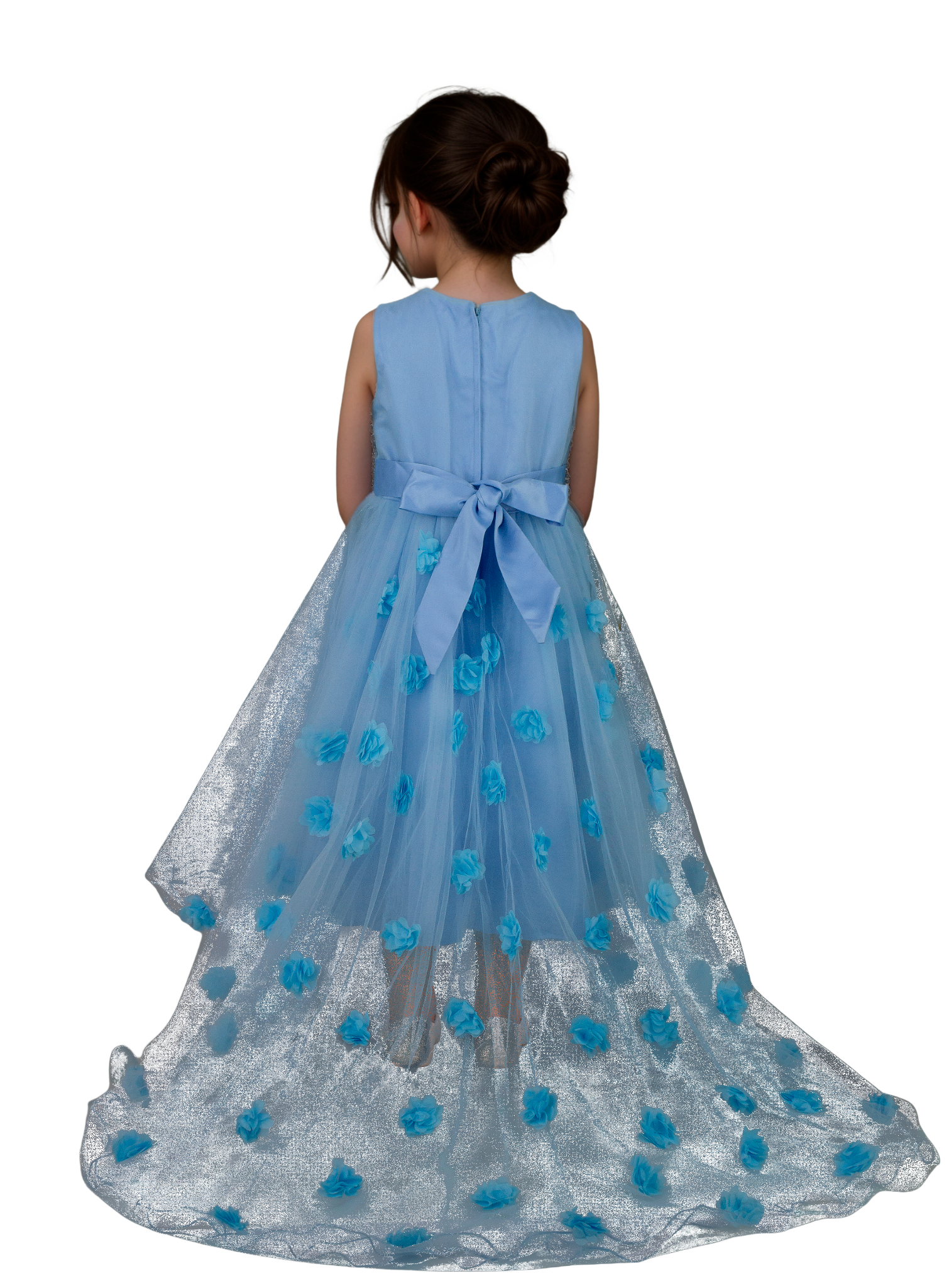 Este vestido de color azul cielo destaca por su delicado bordado floral en el pecho y una combinación única de falda corta y larga con aplicaciones y flores en 3D. Totalmente forrado, ofrece comodidad y un acabado impecable, ideal para ocasiones que requieren elegancia y estilo sofisticado.