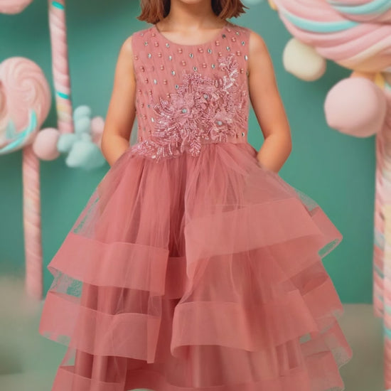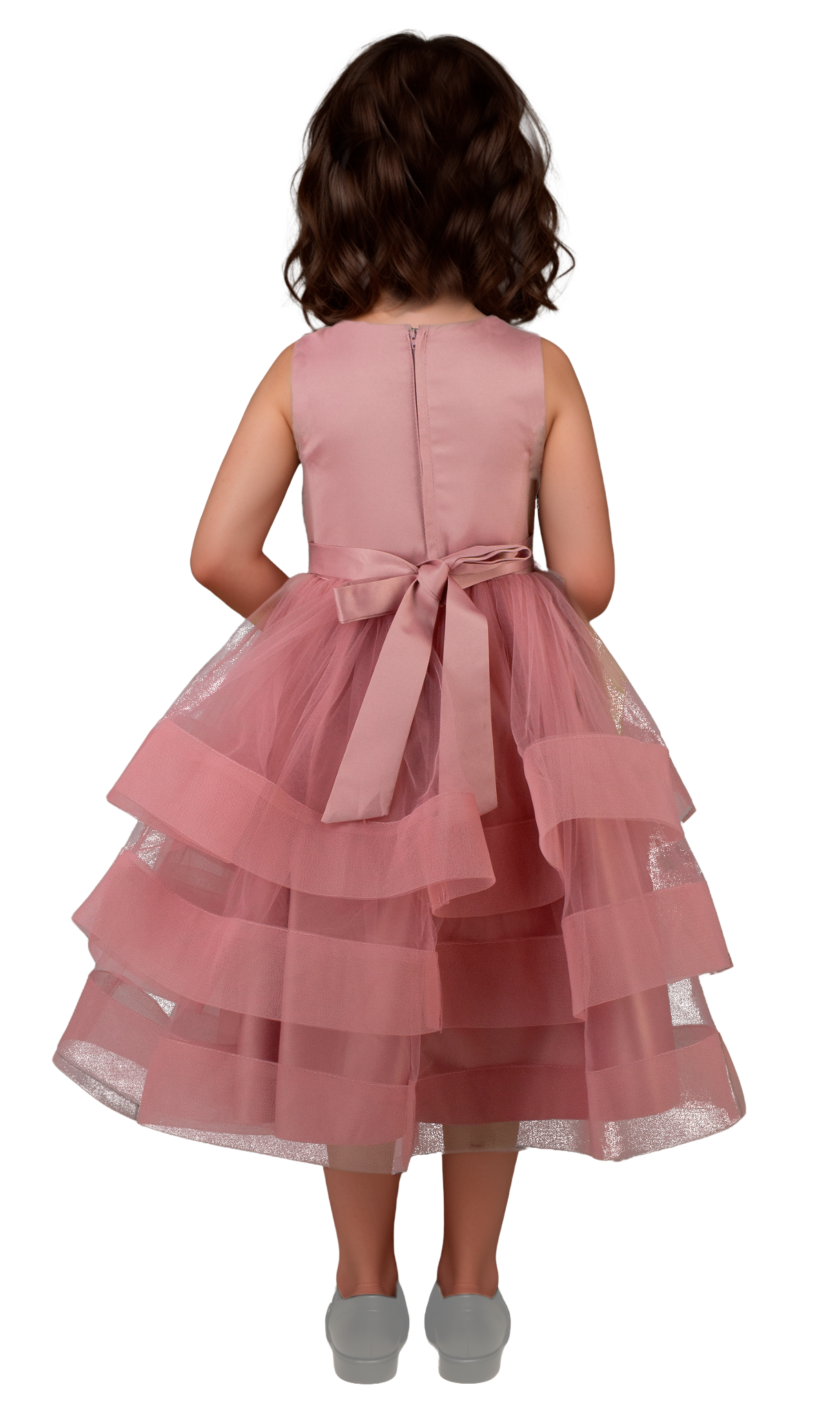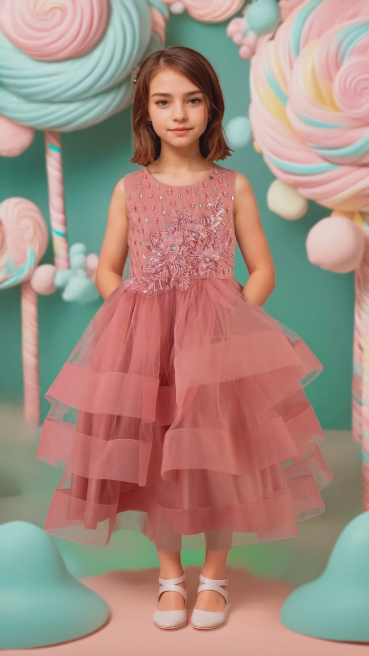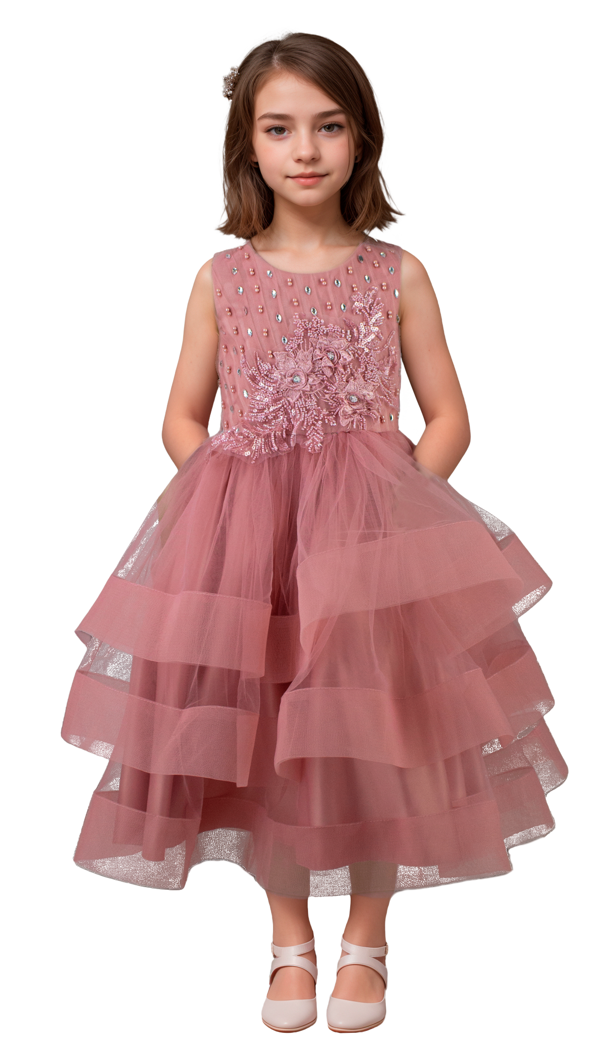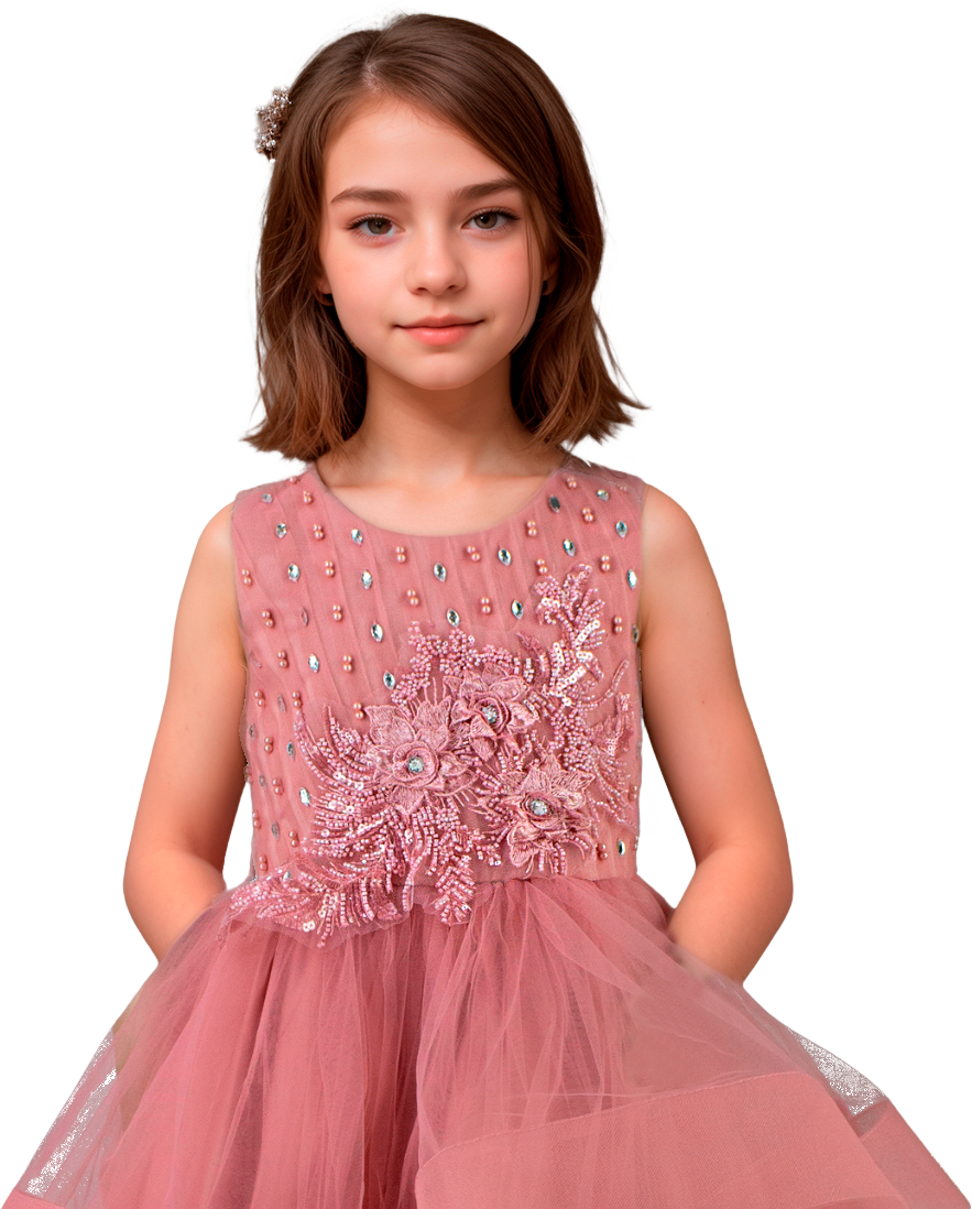 Este vestido para niña en delicado color rosa palo destaca por sus elegantes aplicaciones en el pecho, que aportan un toque sofisticado. La falda amplia de tul ofrece volumen y movimiento, ideal para ocasiones especiales donde la comodidad y el estilo son esenciales. Perfecto para que las pequeñas luzcan radiantes con un diseño que combina suavidad y elegancia.