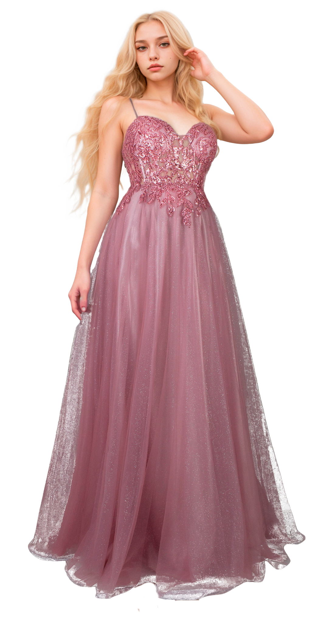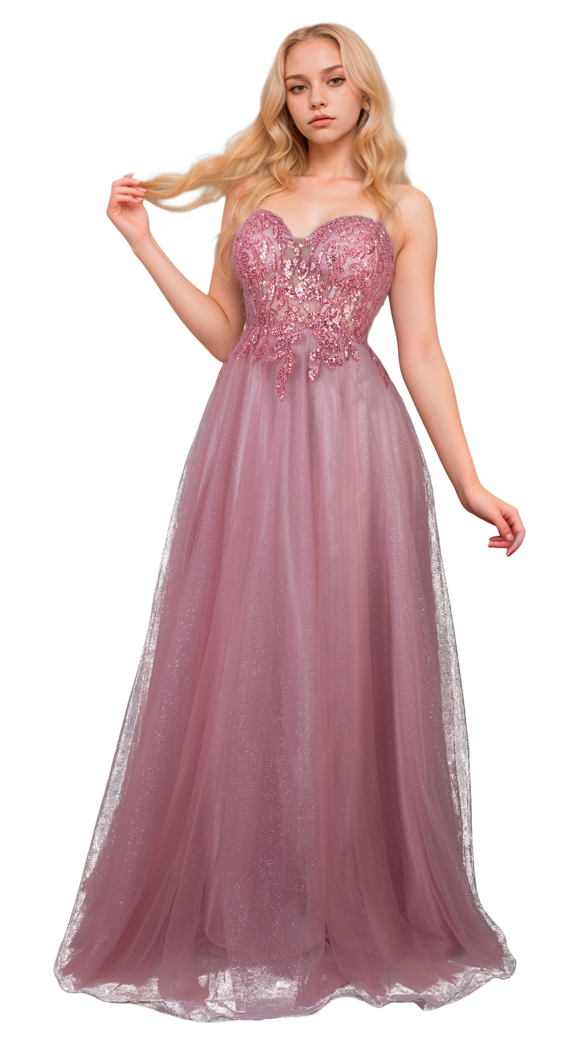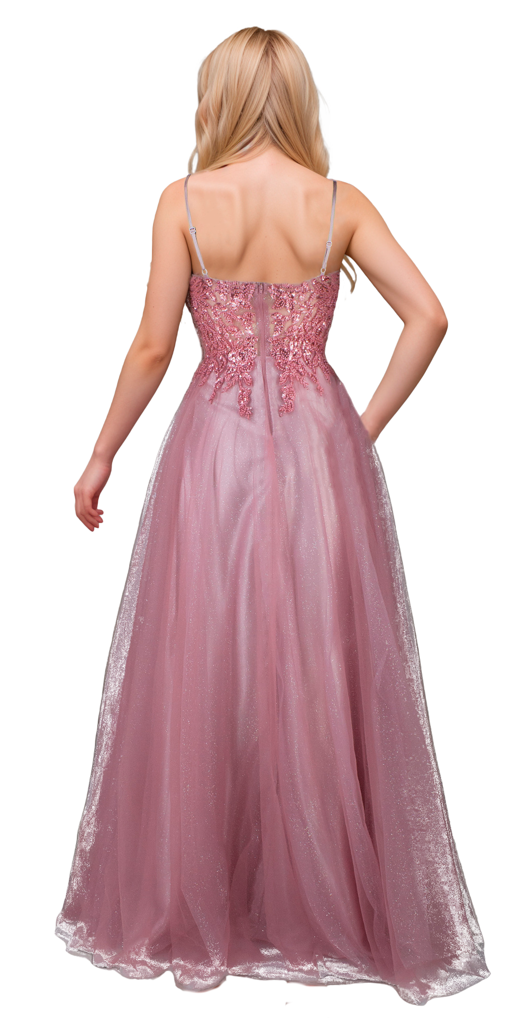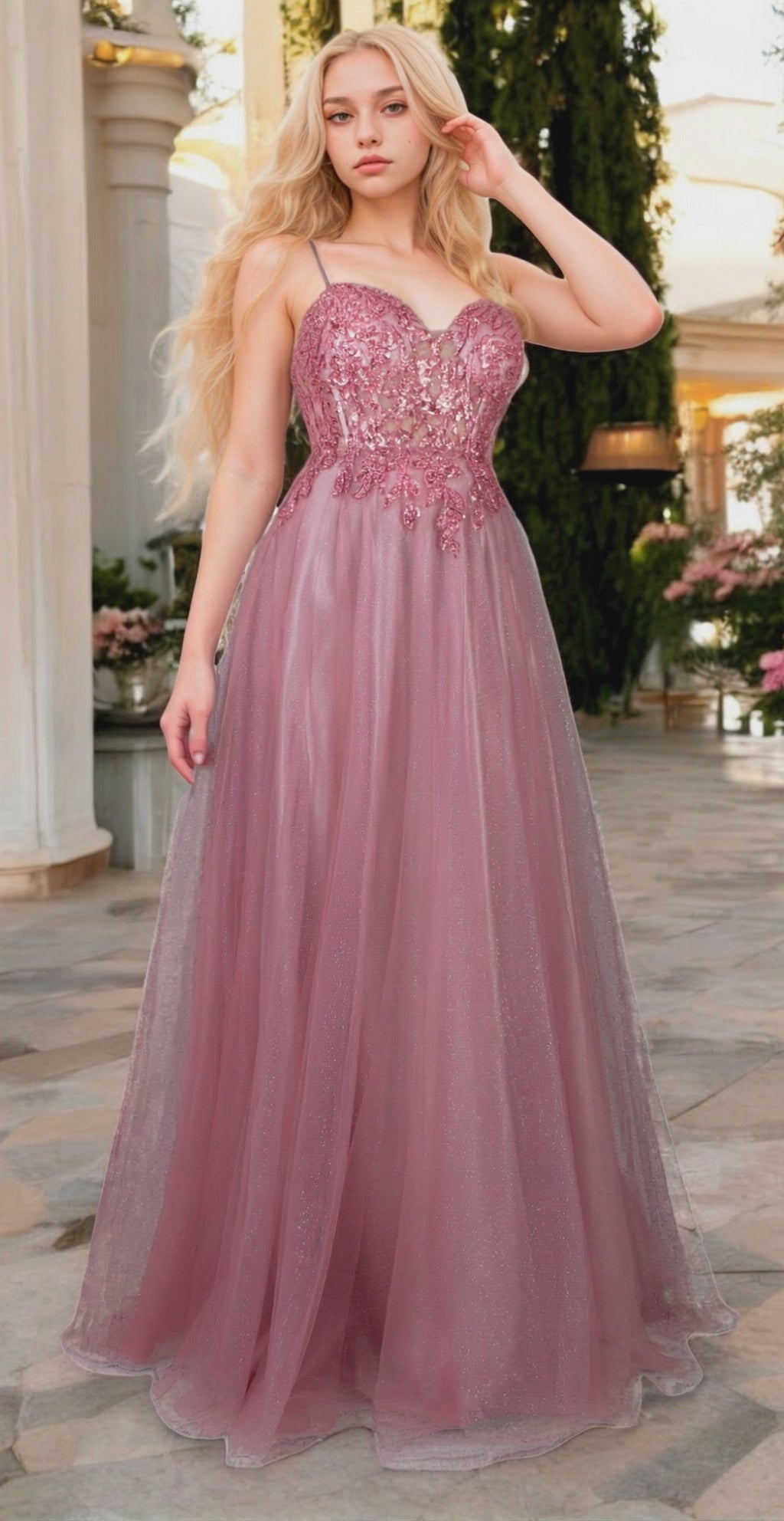 Este vestido rosa con corte princesa destaca por su escote de corazón que realza la figura con elegancia. El talle bordado aporta un detalle artesanal y sofisticado, mientras que la falda de tul con glitter añade un toque de brillo sutil y movimiento delicado. Ideal para ocasiones especiales donde se busca un estilo femenino y refinado.