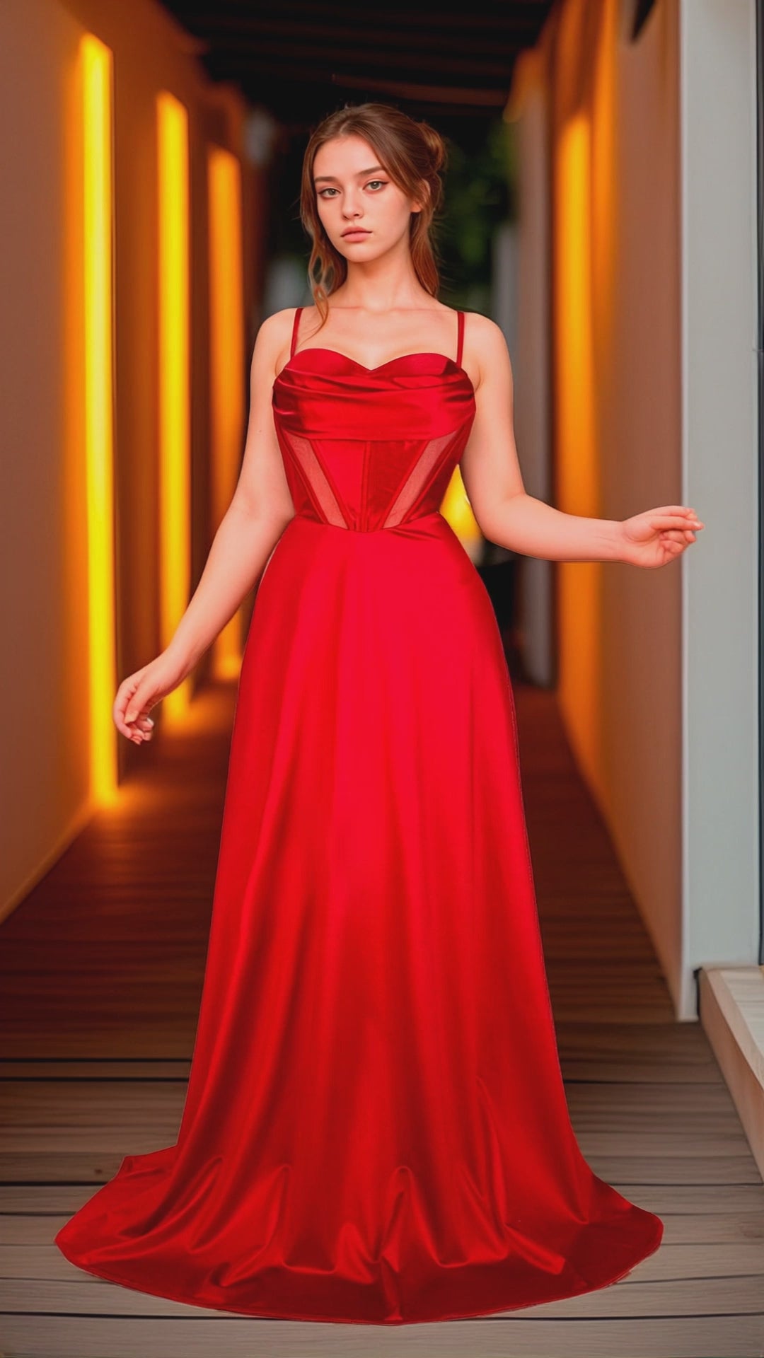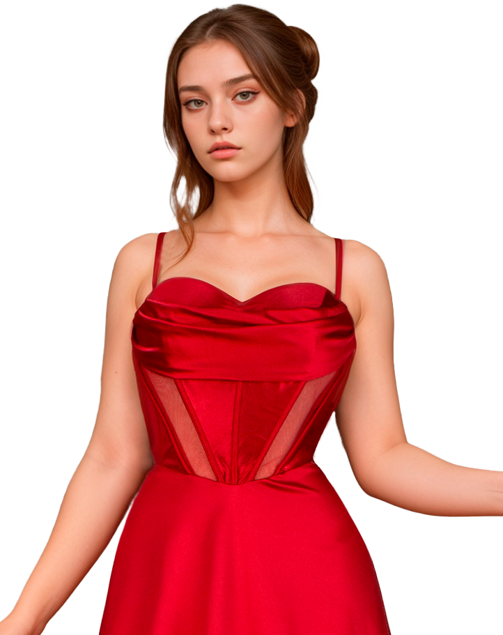 Este elegante vestido presenta un escote corazón que realza la silueta femenina, con un corte princesa que aporta volumen y gracia. Confeccionado en tela licra satinada, combina comodidad y brillo sutil. El corset con barillas ofrece estructura y soporte, mientras que las transparencias aportan un toque sofisticado y moderno a la prenda. Ideal para ocasiones especiales que demandan un estilo distinguido y refinado.