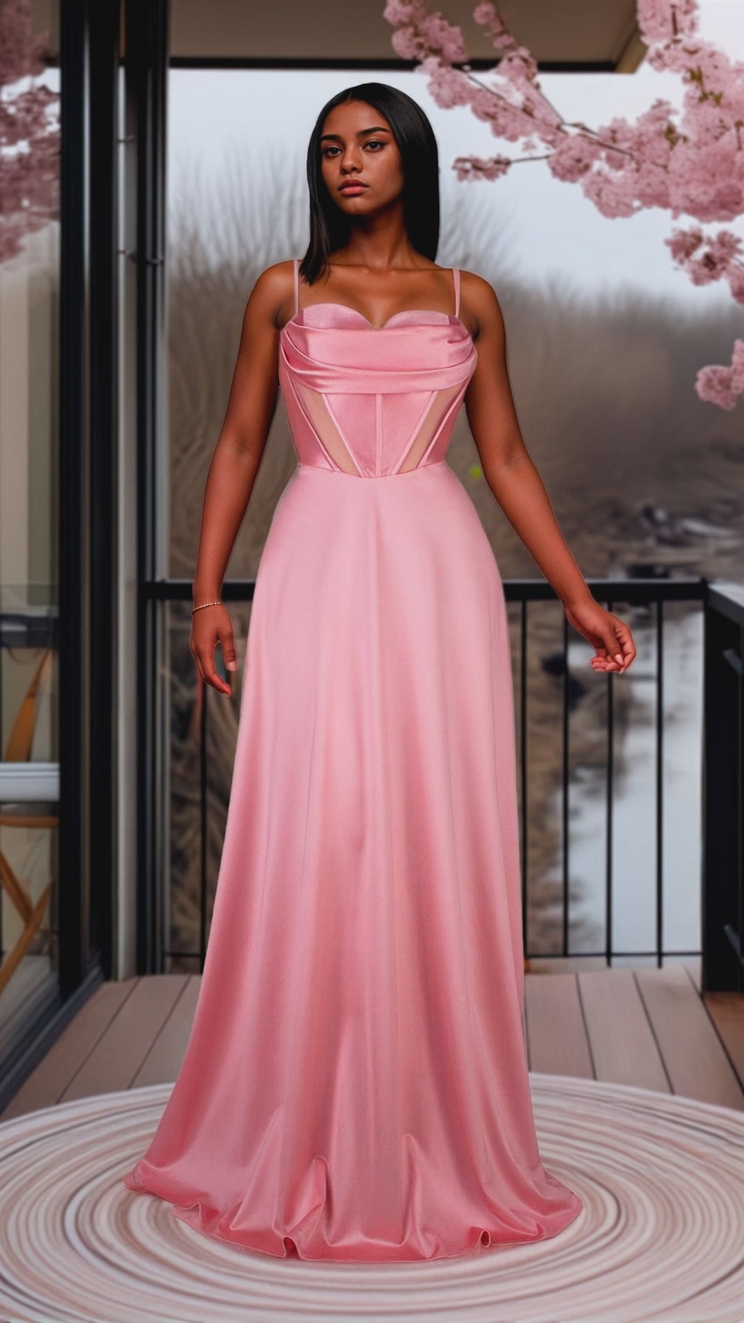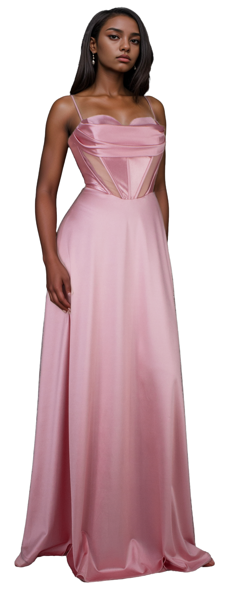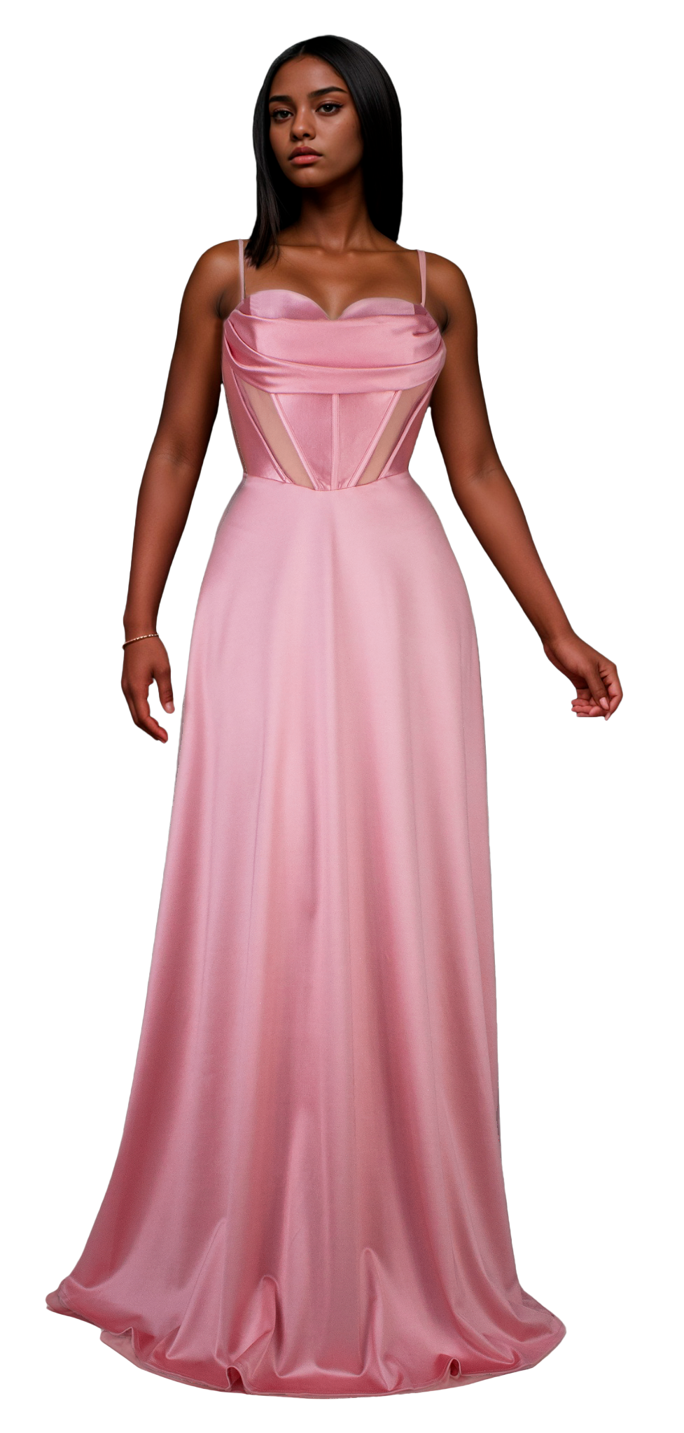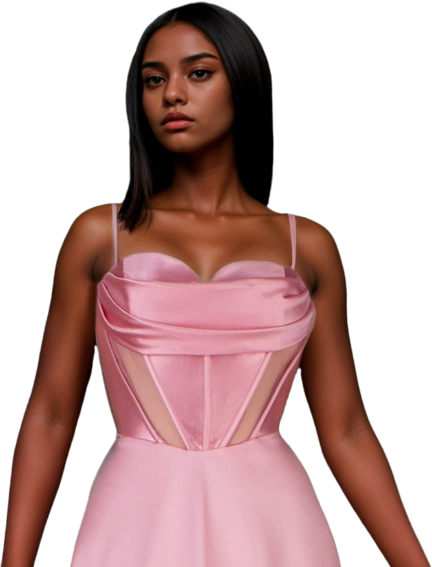 Este elegante vestido rosa presenta un escote de corazón que realza la feminidad, acompañado de transparencias estratégicas en la cintura y corset para definir la figura con sofisticación. Su falda amplia destaca por una caída fluida y un movimiento armonioso, ideal para eventos que requieren un estilo refinado y distinguido.