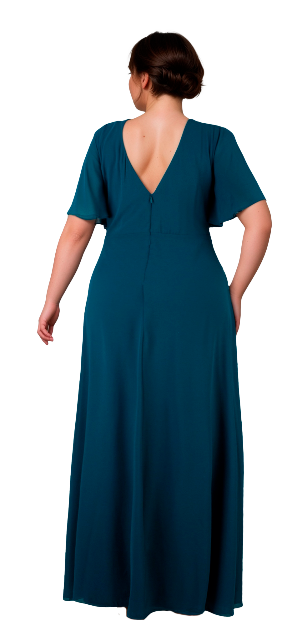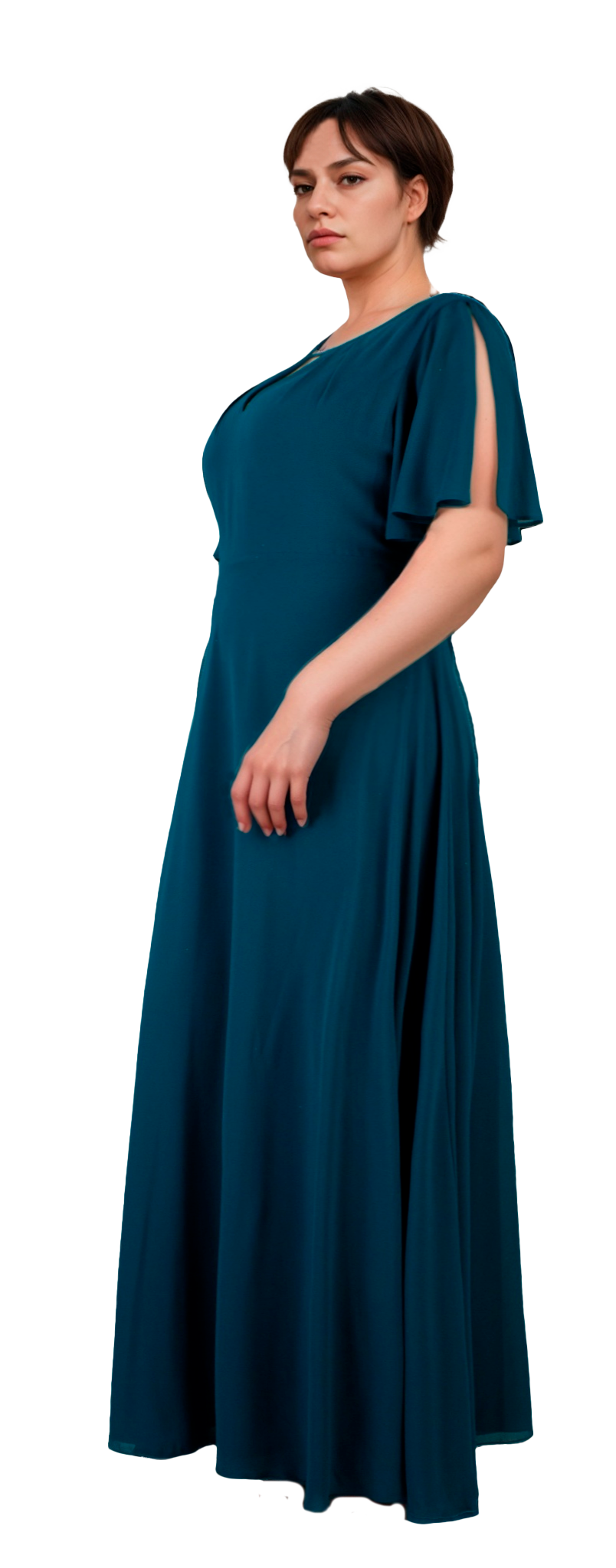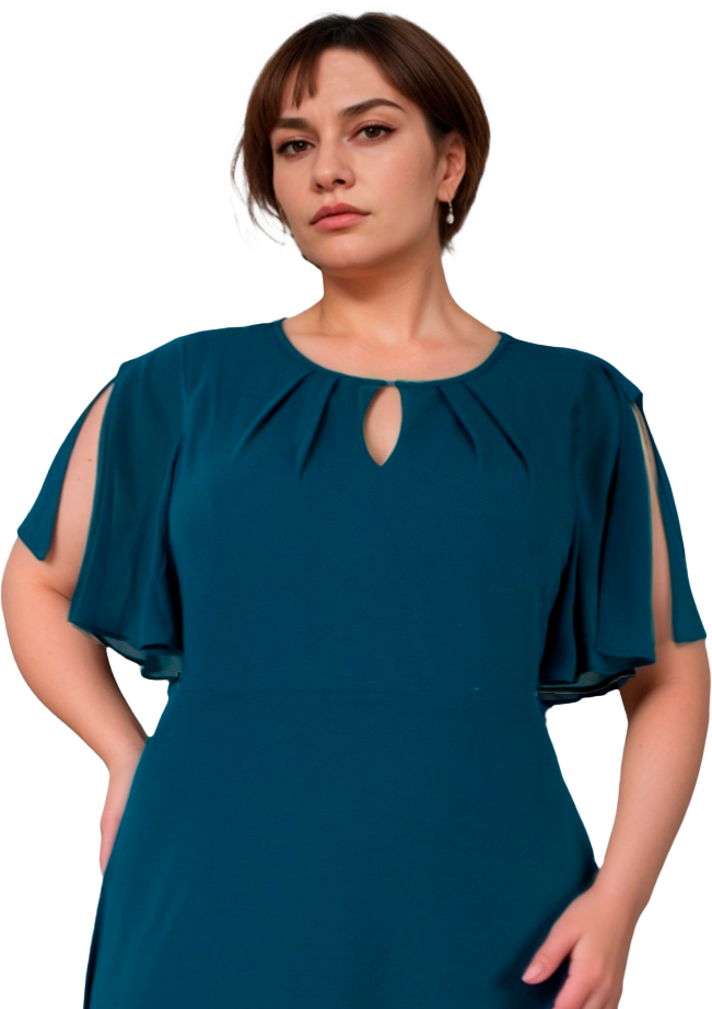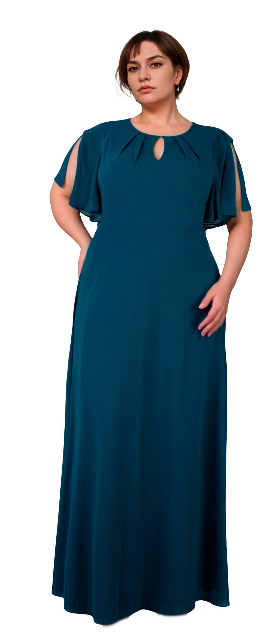Este vestido de chifón en tallas extras ofrece una caída elegante y fluida que realza cualquier figura. Su ajuste perfecto garantiza comodidad y estilo, mientras que las mangas abiertas de 3/4 aportan un toque sofisticado y fresco para cualquier ocasión especial. Ideal para quienes buscan una prenda que combine diseño y confort con un toque sofisticado.