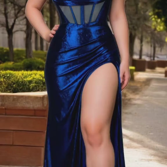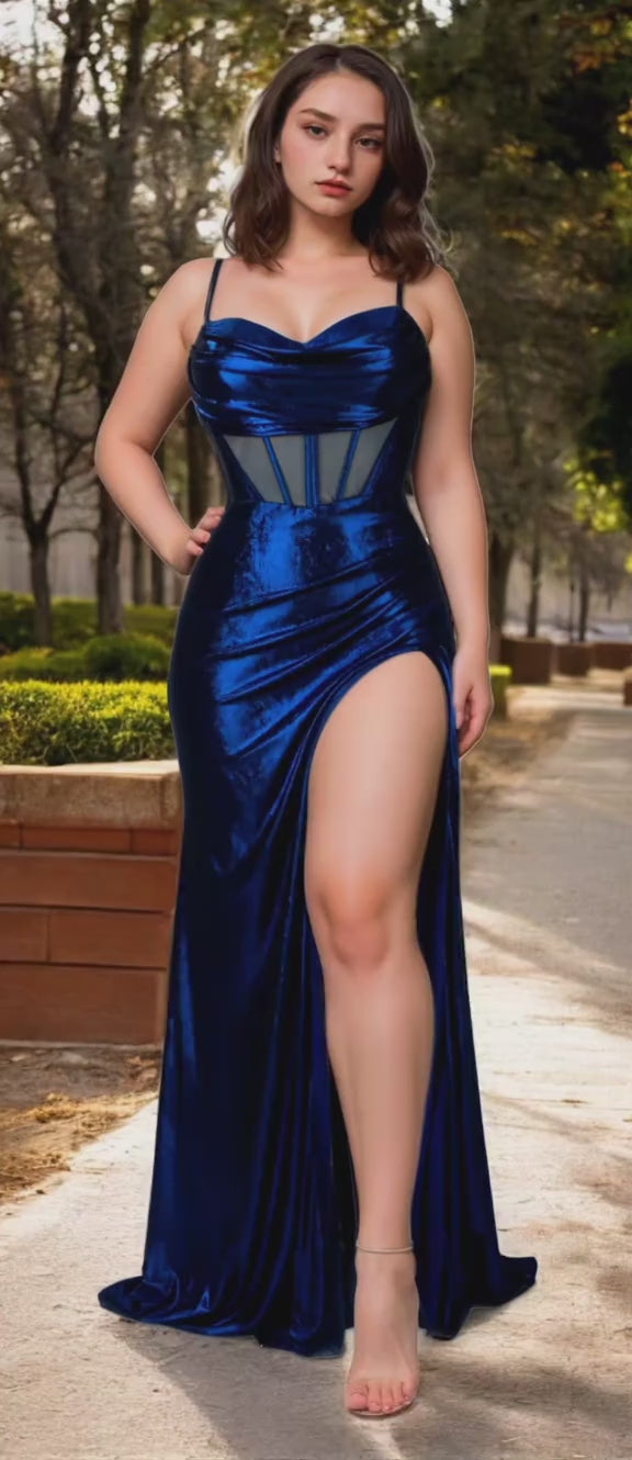 Este vestido de gala azul metálico destaca por su elegante escote de corazón que realza la figura femenina, mientras que la abertura en la pierna añade un toque sofisticado y sensual. Su acabado metálico aporta un brillo sutil que captura la luz, ideal para eventos formales donde se busca un estilo distinguido y moderno. Perfecto para quienes desean combinar glamour y comodidad en una sola prenda.