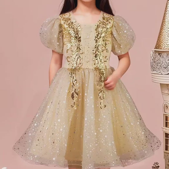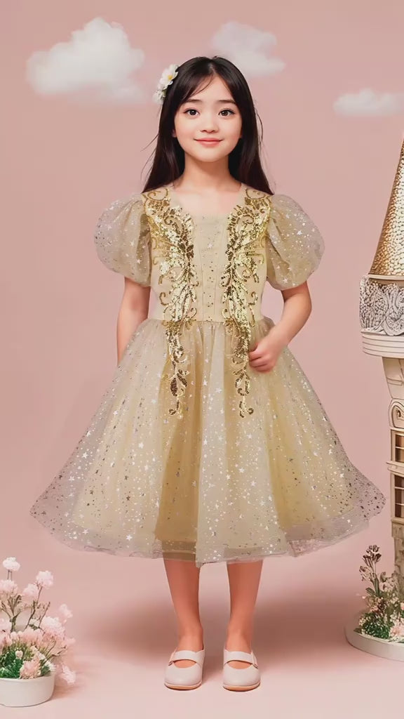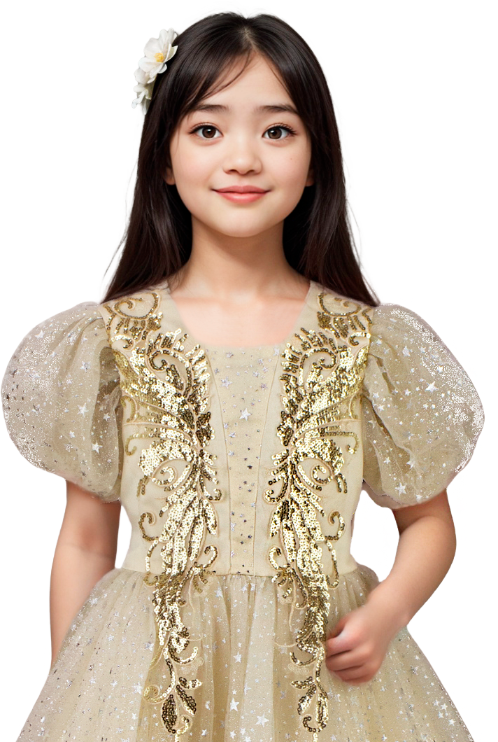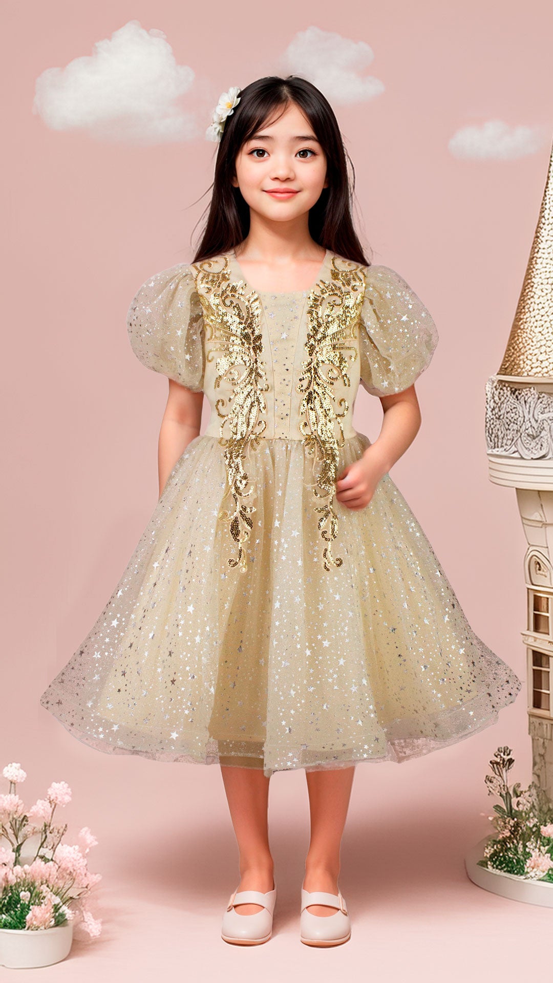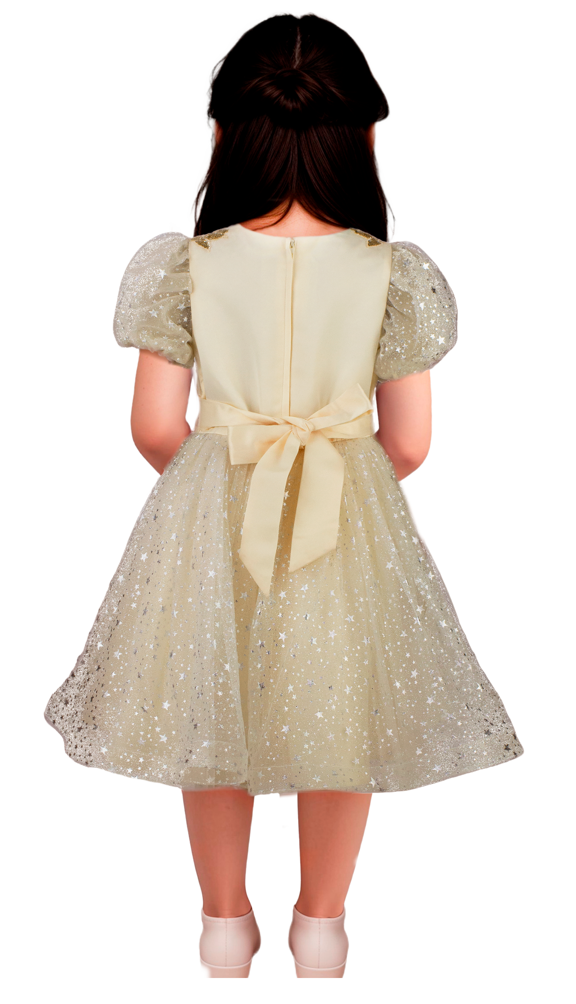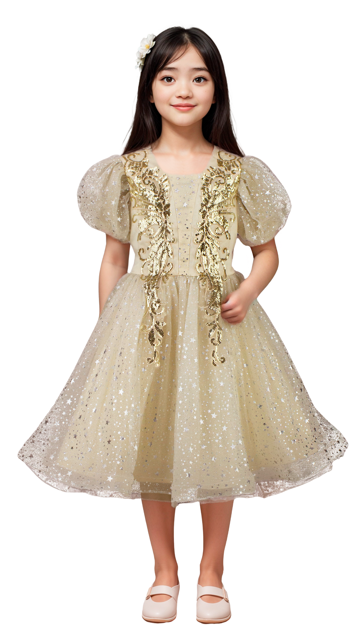 Este vestido de niña presenta un delicado estampado de estrellas que aporta un toque encantador y original. Sus mangas bombachas ofrecen comodidad y un estilo único, mientras que las aplicaciones en el pecho añaden un detalle sofisticado que realza el diseño. Perfecto para ocasiones especiales, combina elegancia y frescura para que tu niña luzca impecable con total comodidad.